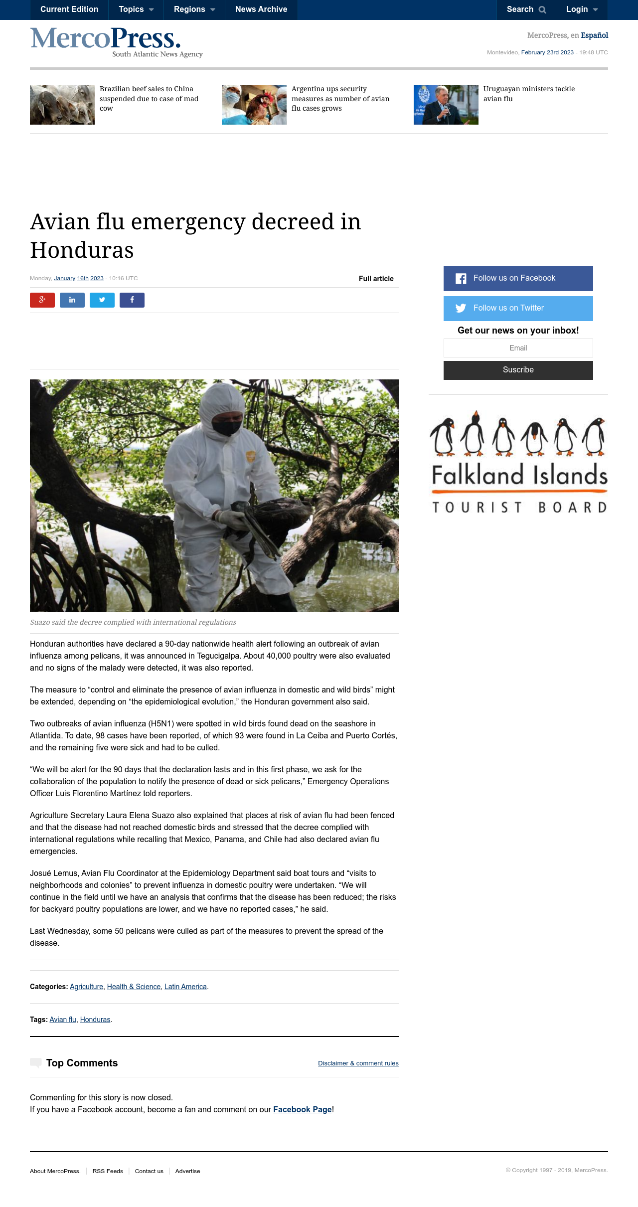 Honduran authorities have declared a 90-day nationwide health alert following an outbreak of avian influenza among pelicans, it was announced in Tegucigalpa. About 40,000 poultry were also evaluated and no signs of the malady were detected, it was also reported.