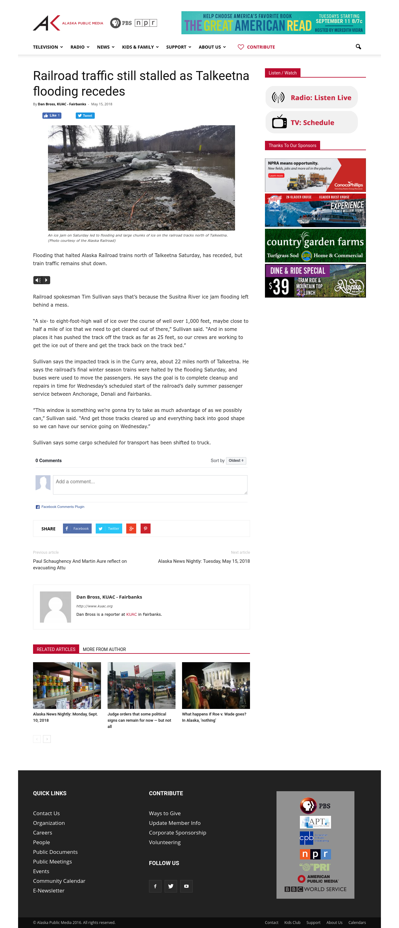 An ice jam on Saturday led to flooding and large chunks of ice on the railroad tracks north of Talkeetna.