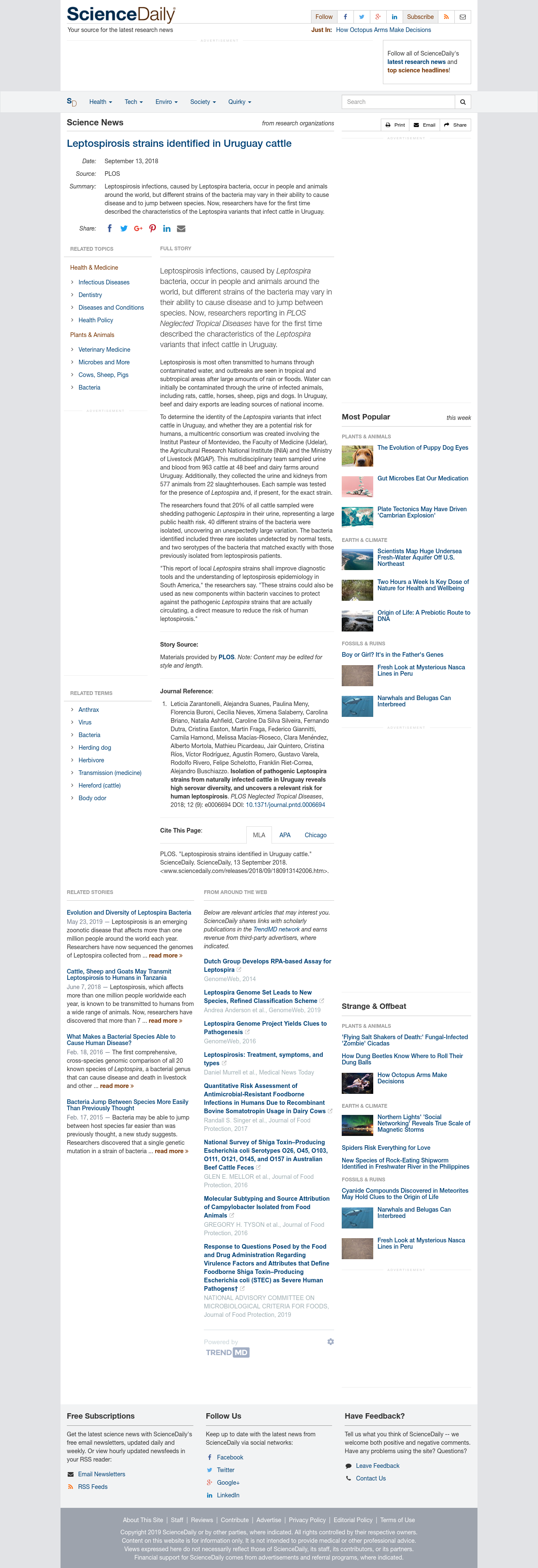 Zarantonelli et al. 2018. Isolation of pathogenic Leptospira strains from naturally infected cattle in Uruguay reveals high serovar diversity, and uncovers a relevant risk for human leptospirosis. PLOS Neglected Tropical Diseases 12 (9): e0006694 DOI: 10.1371/journal.pntd.0006694
