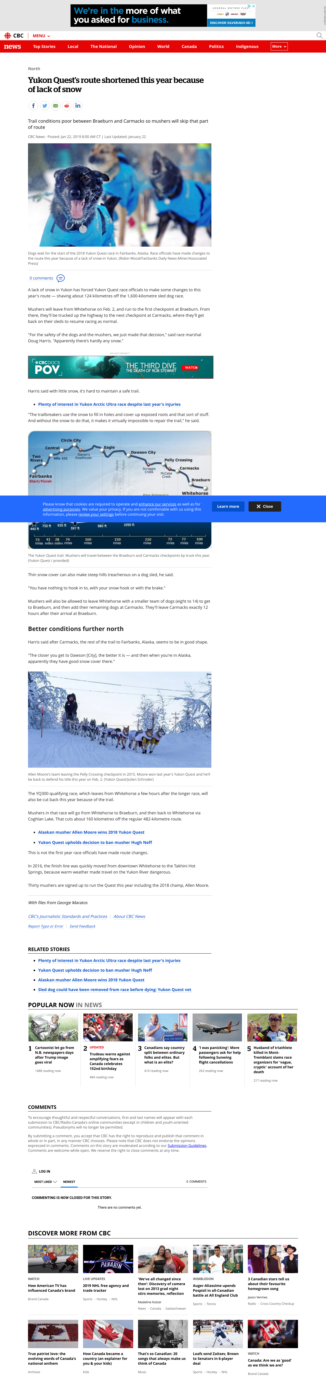 For safety dogs and mushers will be trucked from Braeburn to Carmacks.