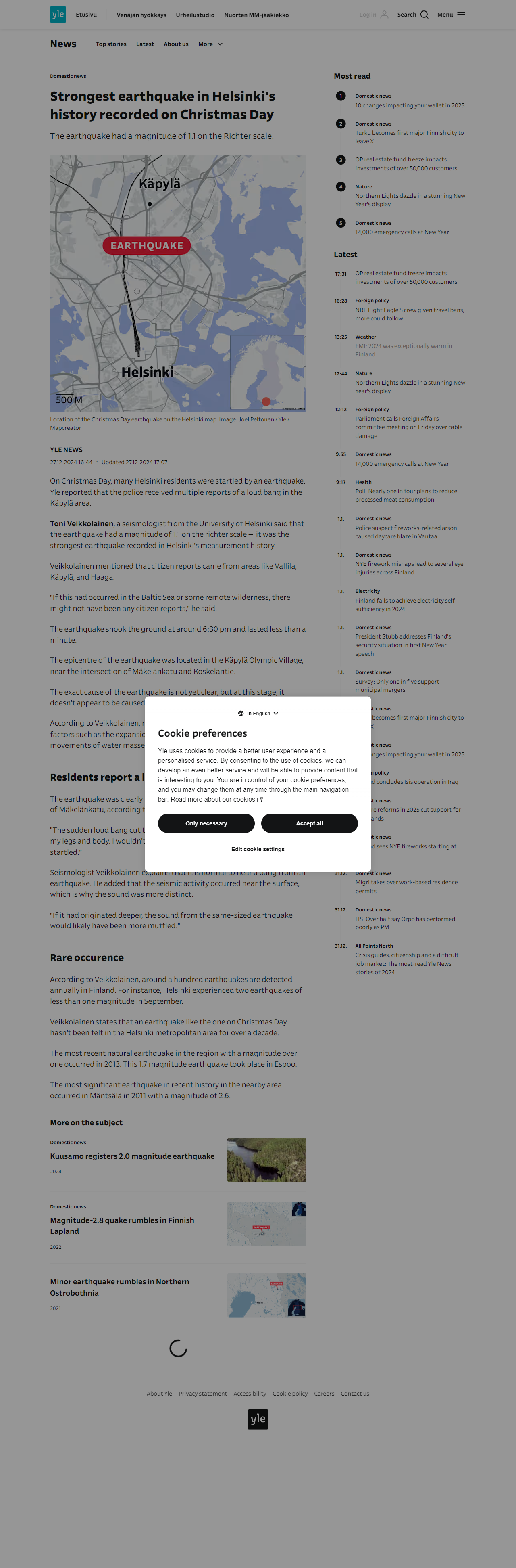Helsinki experienced its strongest recorded earthquake on Christmas Day, with a magnitude of 1.1. Though minor, it startled many residents, who reported a loud bang in the Käpylä area.