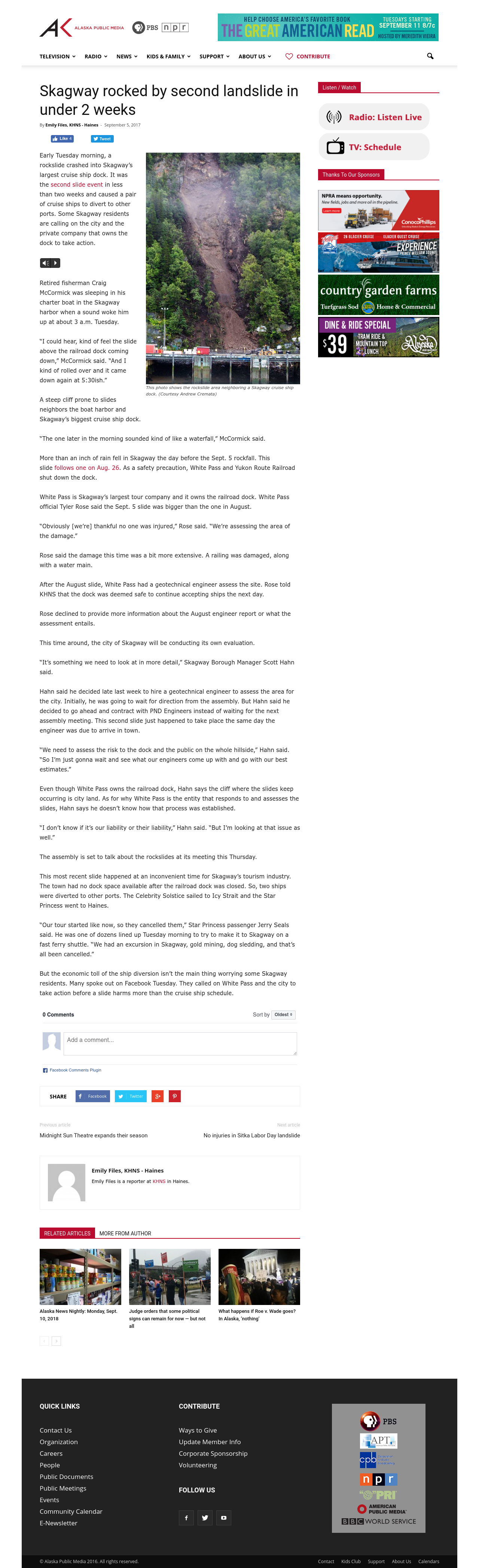 Early Tuesday morning, a rockslide crashed into Skagway’s largest cruise ship dock. It was the second slide event in less than two weeks and caused a pair of cruise ships to divert to other ports. Some Skagway residents are calling on the city and the private company that owns the dock to take action.