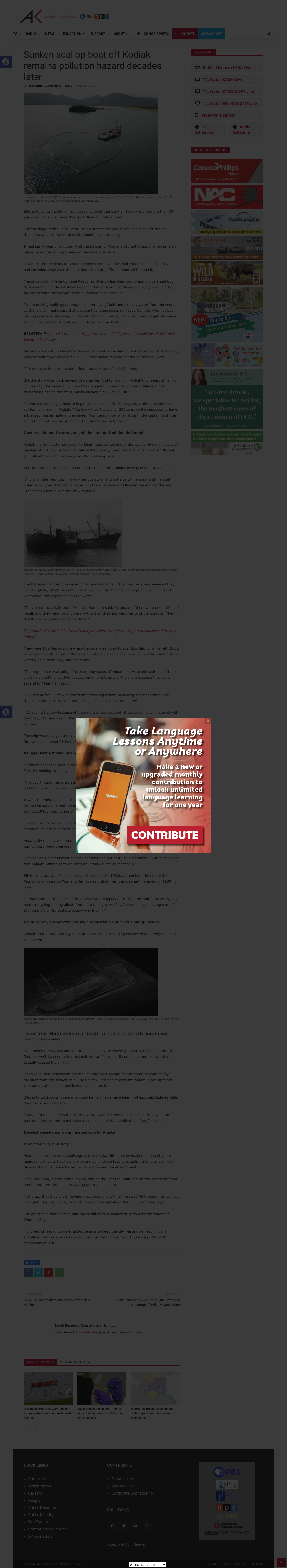 The sunken scallop boat, Saint Patrick, remains a pollution hazard off the coast of Kodiak, Alaska, decades after sinking in 1989, bringing up memories of a devastating fishing disaster in 1981 that claimed nine lives.