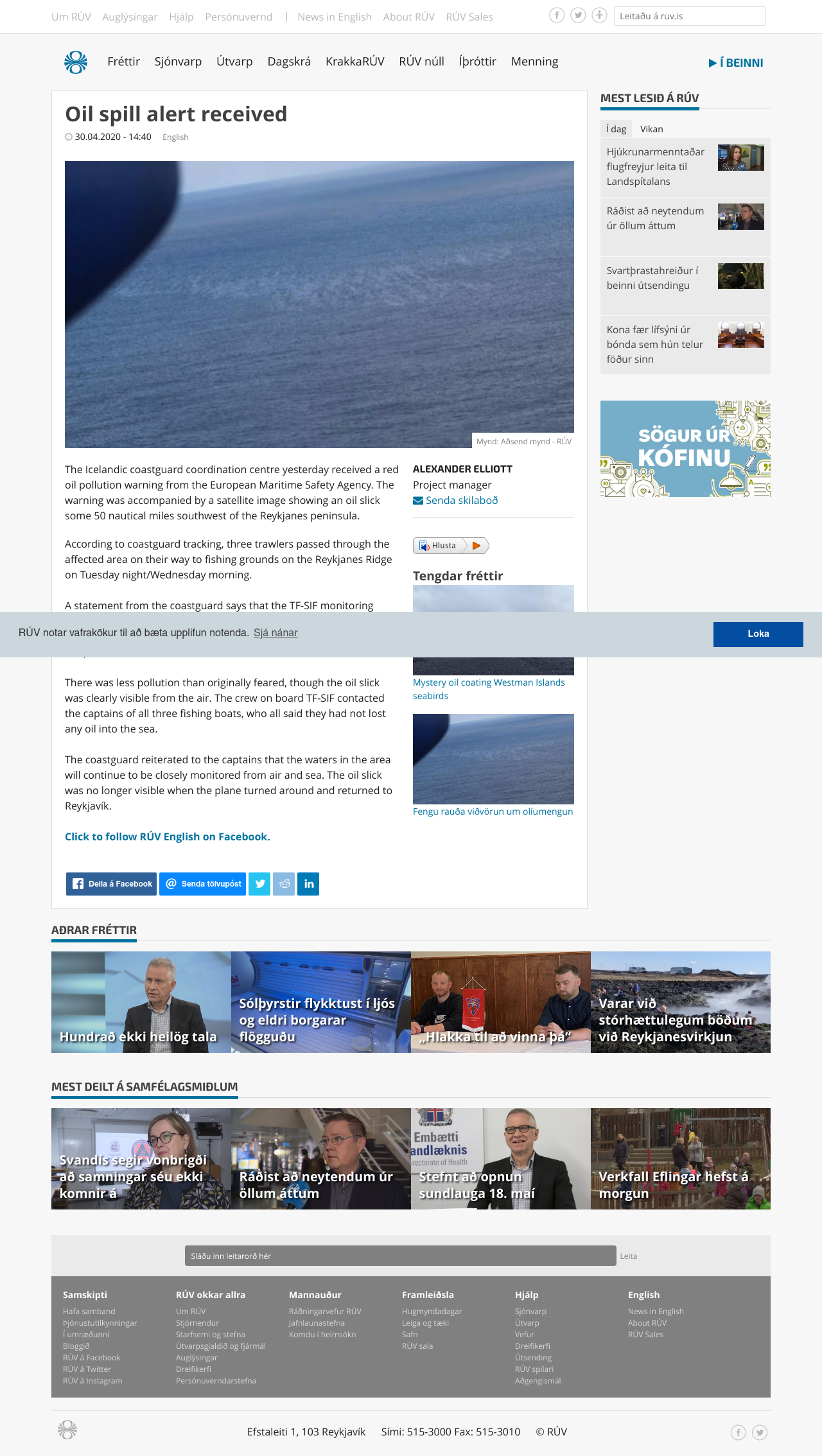 The Icelandic coastguard coordination centre yesterday received a red oil pollution warning from the European Maritime Safety Agency. The warning was accompanied by a satellite image showing an oil slick some 50 nautical miles southwest of the Reykjanes peninsula.