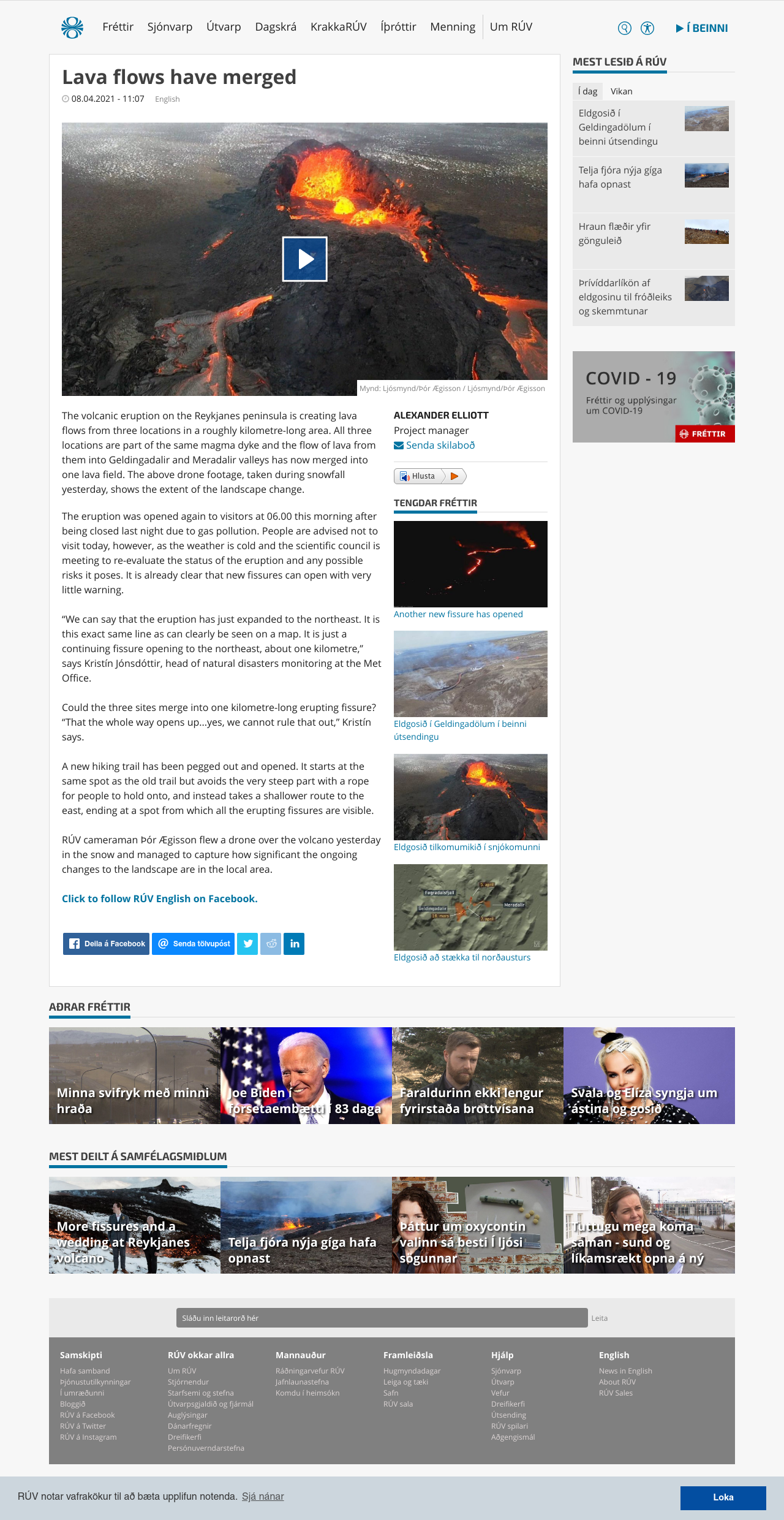 The volcanic eruption on the Reykjanes peninsula is creating lava flows from three locations in a roughly kilometre-long area. All three locations are part of the same magma dyke and the flow of lava from them into Geldingadalir and Meradalir valleys has now merged into one lava field.