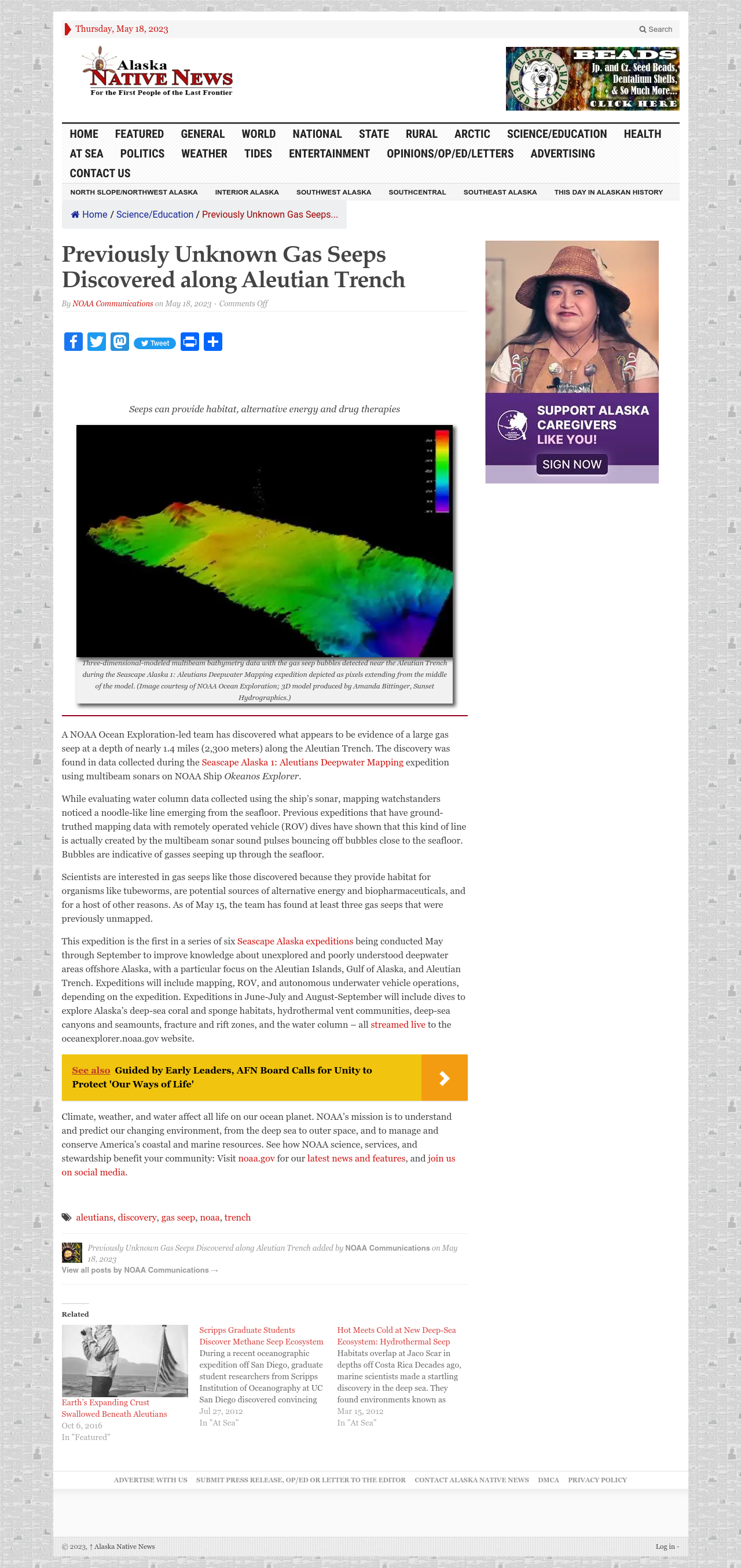 A NOAA Ocean Exploration-led team has discovered what appears to be evidence of a large gas seep at a depth of nearly 1.4 miles (2,300 meters) along the Aleutian Trench. The discovery was found in data collected during the Seascape Alaska 1: Aleutians Deepwater Mapping expedition.