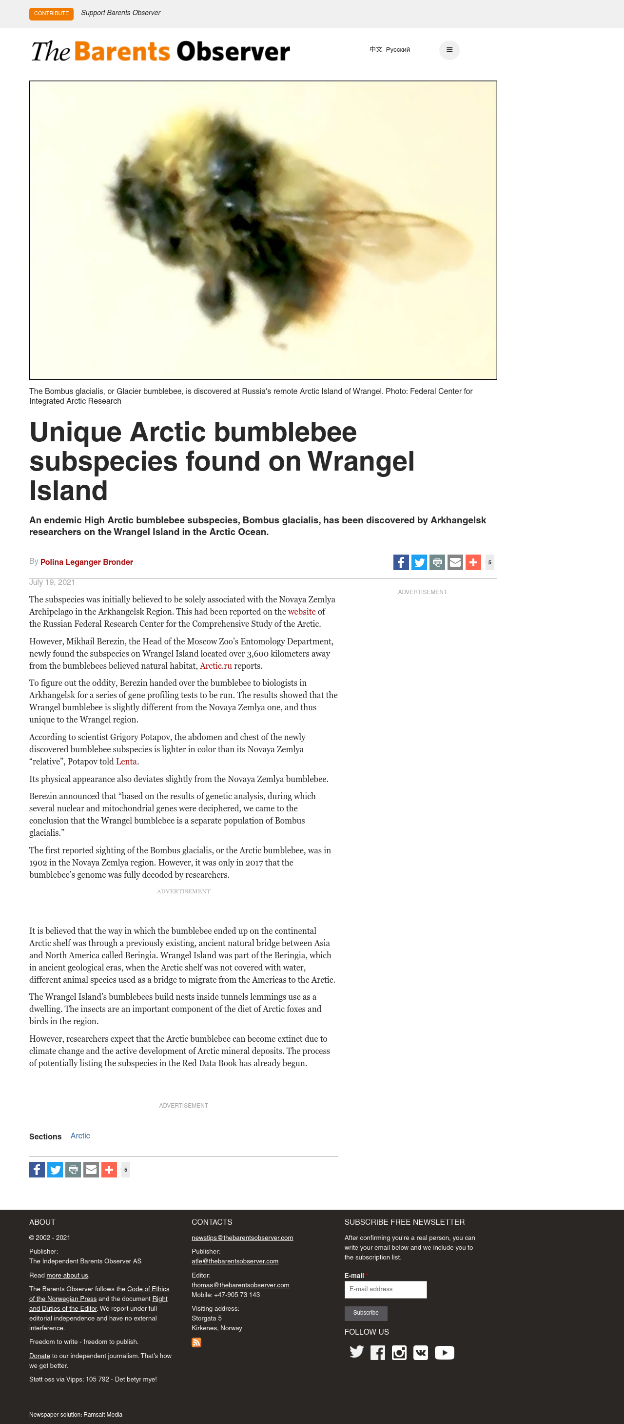 An endemic High Arctic bumblebee subspecies, Bombus glacialis, has been discovered by Arkhangelsk researchers on the Wrangel Island in the Arctic Ocean.