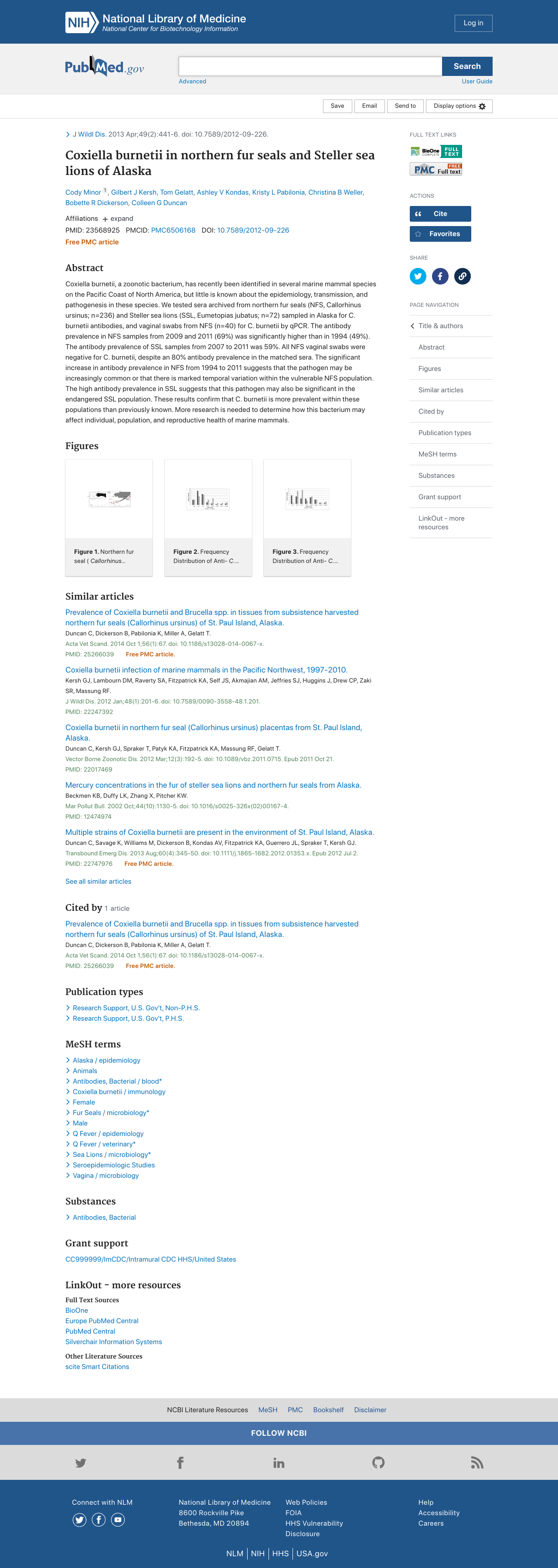 Coxiella burnetii, a zoonotic bacterium, has recently been identified in several marine mammal species on the Pacific Coast of North America, but little is known about the epidemiology, transmission, and pathogenesis in these species.
