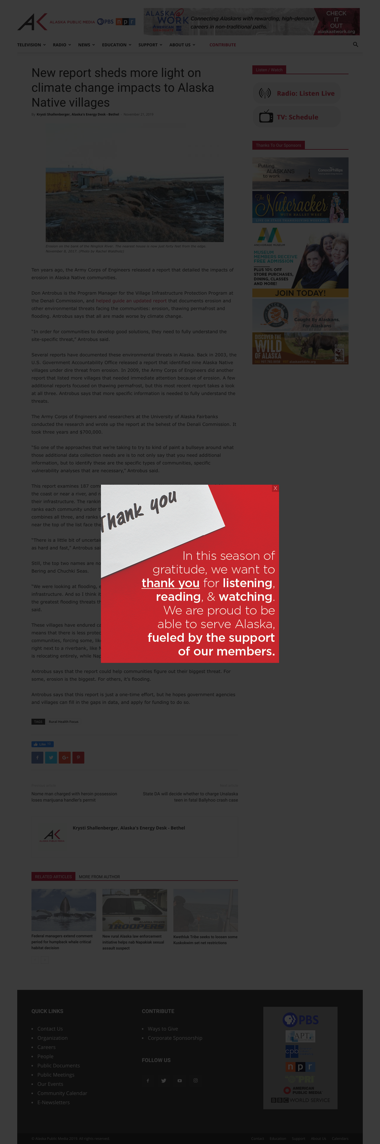 A recent report compiled by the Army Corps of Engineers and researchers at the University of Alaska Fairbanks documents erosion and other environmental threats facing communities in rural Alaska.