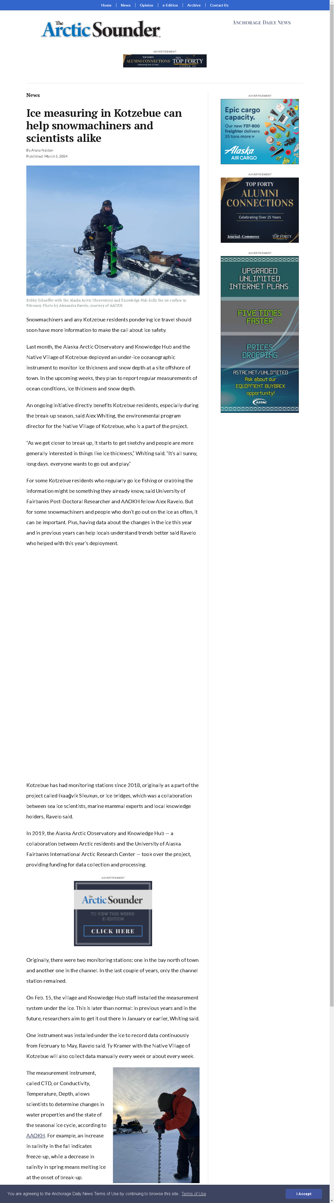The Alaska Arctic Observatory and Knowledge Hub and the Native Village of Kotzebue deployed an under-ice oceanographic instrument to monitor ice thickness and snow depth at a site offshore of town.