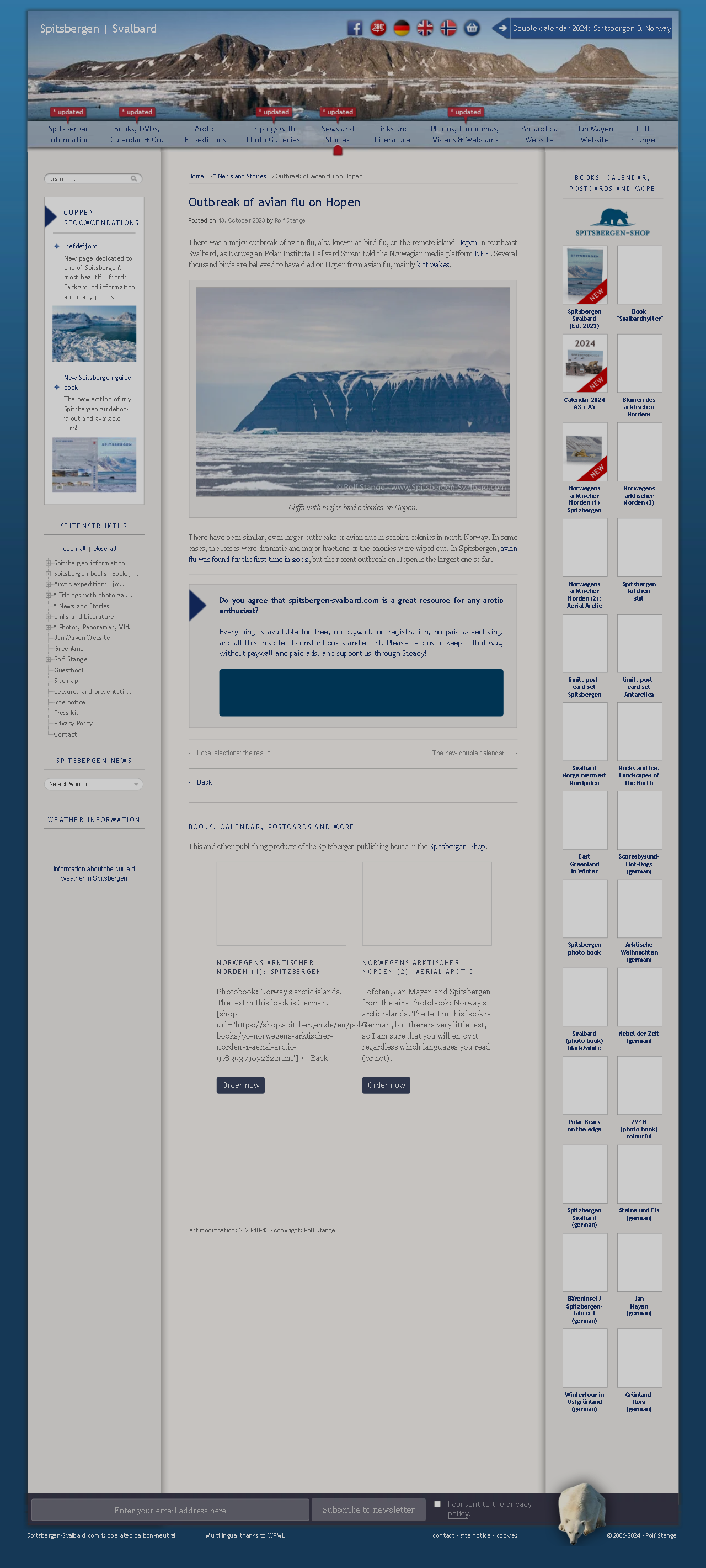 There have been similar, even larger outbreaks of avian flue in seabird colonies in north Norway. In some cases, the losses were dramatic and major fractions of the colonies were wiped out. In Spitsbergen, avian flu was found for the first time in 2002, but the recent outbreak on Hopen is the largest one so far.