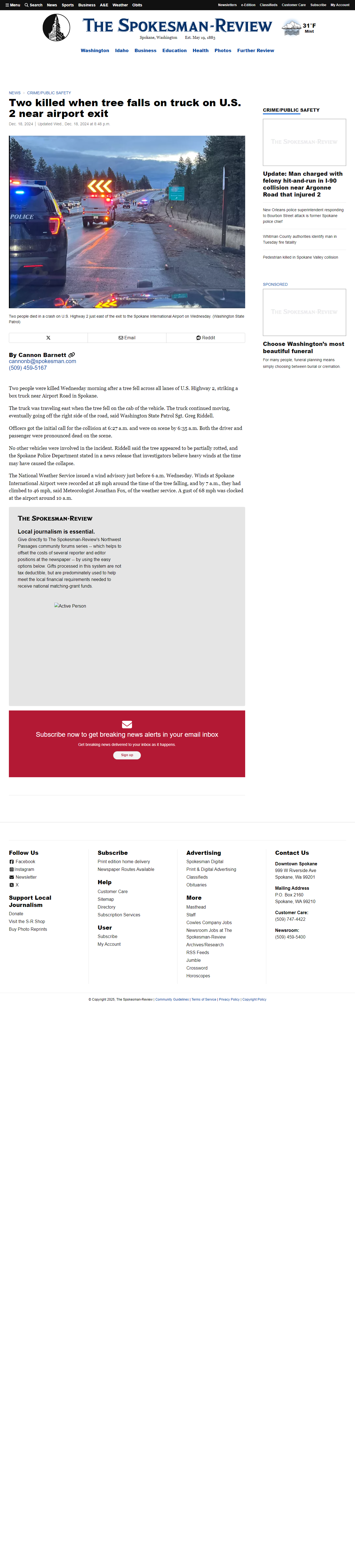Two people were killed when a tree fell on their truck on U.S. Highway 2 near Spokane International Airport, likely due to heavy winds.
