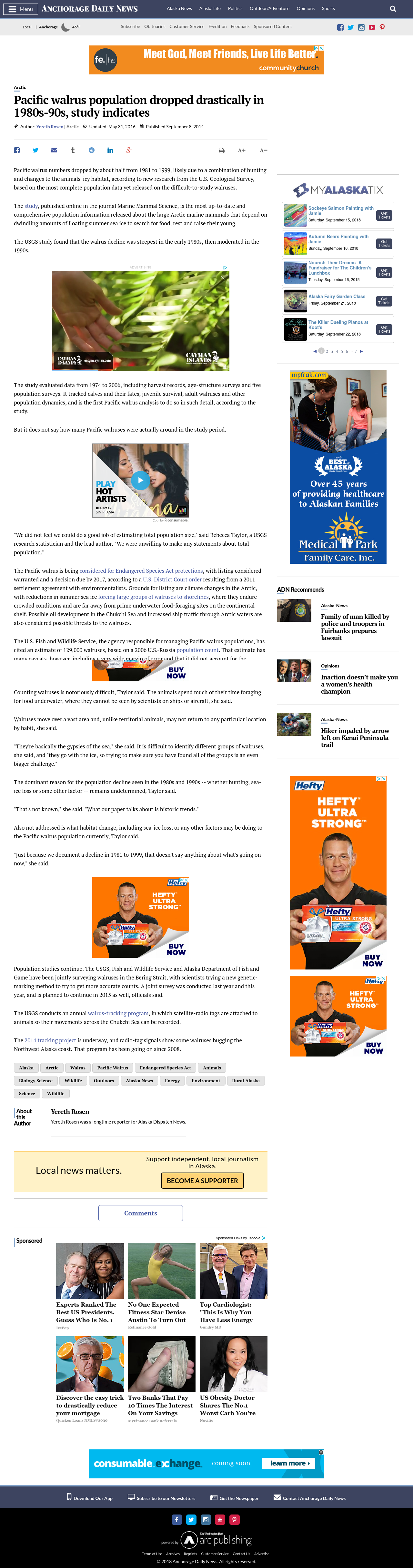 The notoriously difficult-to-study Pacific walrus population decreased by about half between 1981 and 1999, likely due to hunting and changes to sea-ice habitat, according to a new USGS study that is considered the most up-to-date and comprehensive so far. The Pacific walrus is being considered for Endangered Species Act protections.