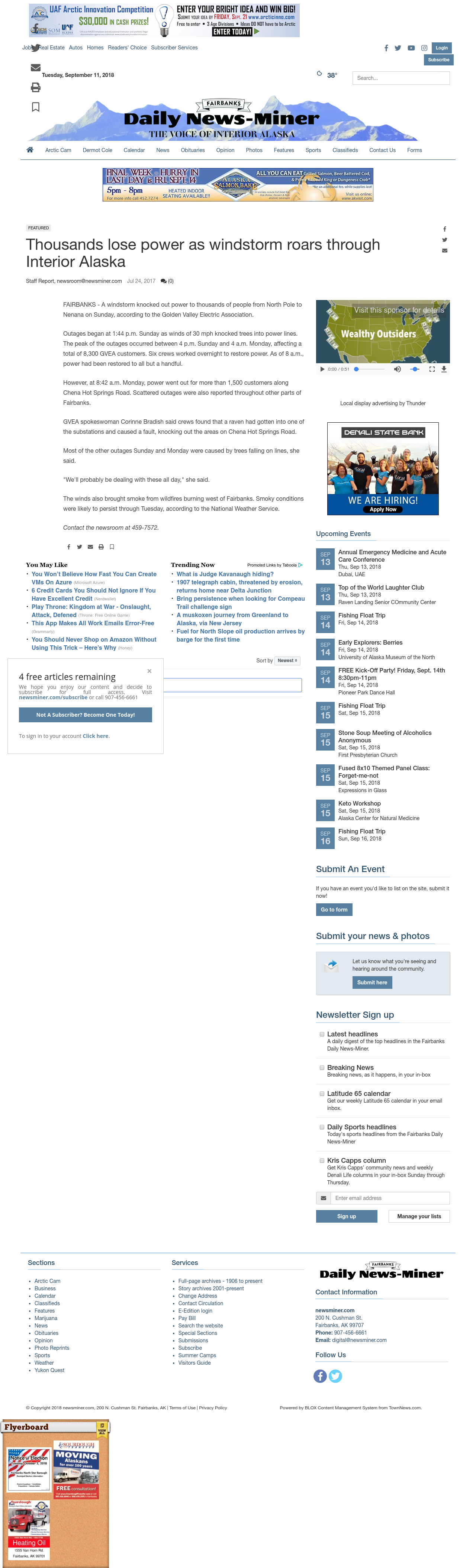 FAIRBANKS - A windstorm knocked out power to thousands of people from North Pole to Nenana on Sunday, according to the Golden Valley Electric Association.