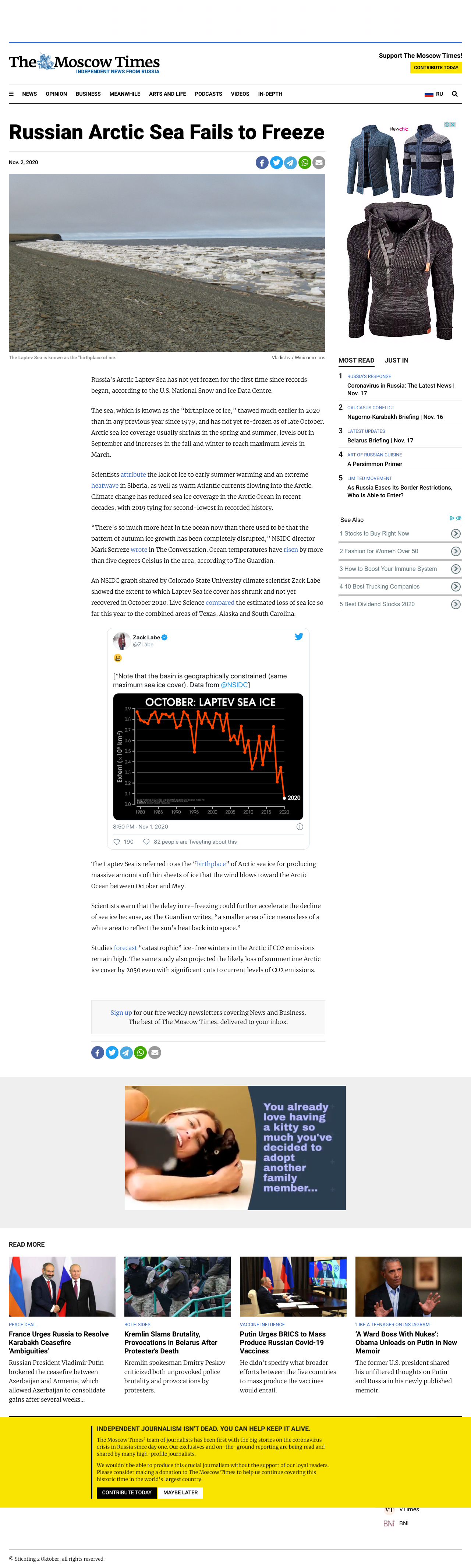 For the first time since records began, the Laptev Sea has not yet formed sea ice by the end of October. Scientists attribute the lack of ice to early summer warming and an extreme heatwave in Siberia, as well as warm Atlantic currents flowing into the Arctic.