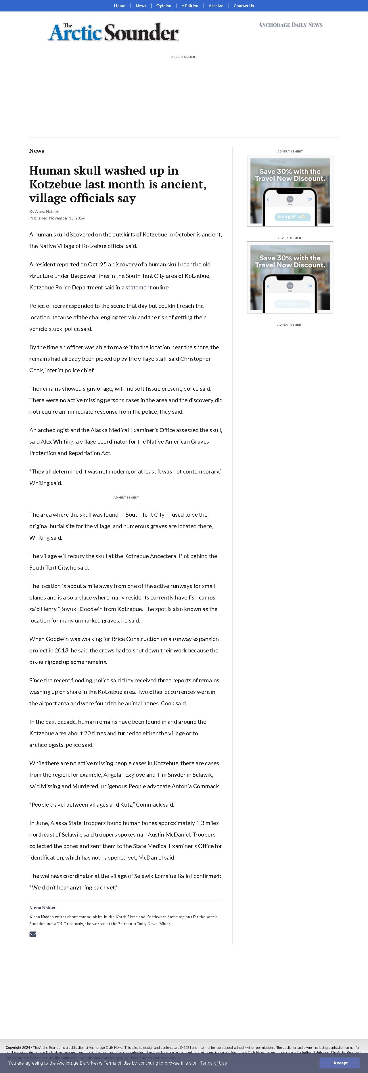 The attached articles (See Also) provide context for understanding the discovery of the ancient skull in Kotzebue. Several observations document the powerful storms and resulting flooding in the region in October 2024 (e.g., "Fall storm damages houses in Kotzebue and Northwest Alaska villages," "Storm Submerges Kotzebue"). These storms likely contributed to the skull being unearthed and washing ashore. Furthermore, observations from St. Michael in 2022 and 2023 ("A year after the Merbok Storm: Impacts on Cemetery," "Storm Merbok causes erosion to cemetary") illustrate how storms and coastal erosion in Alaska are increasingly impacting burial sites and leading to the exposure of human remains. The 2015 observation from Utqiagvik ("Eroding Arctic coastline reveals human bones") underscores the long-term trend of coastal erosion revealing human remains due to climate change and increasingly powerful storms.The fact that the skull was found in Kotzebue's South Tent City area, a known former burial ground, and the previous discovery of remains during the 2013 runway expansion reinforce the likelihood that this is an ancient burial disturbed by natural processes, particularly given the recent storms. The police statement about multiple reports of remains washing ashore although the others were animal bones - further highlights the impact of the recent extreme weather. While this skull has been deemed ancient, the challenges faced in identifying remains and the ongoing search for missing individuals underscores the importance of careful examination and collaboration with local communities. Furthermore, it highlights the vulnerability of coastal communities to climate change impacts and the resulting need for archaeologists and other experts to collaborate on best practices with Alaska Native communities related to ancestral remains reburial. [See: https://uaf-iarc.org/news/protecting-alaska-native-ancestral-remains/ University of Alaska Fairbanks news article regarding Alaska Native ancestral remains.