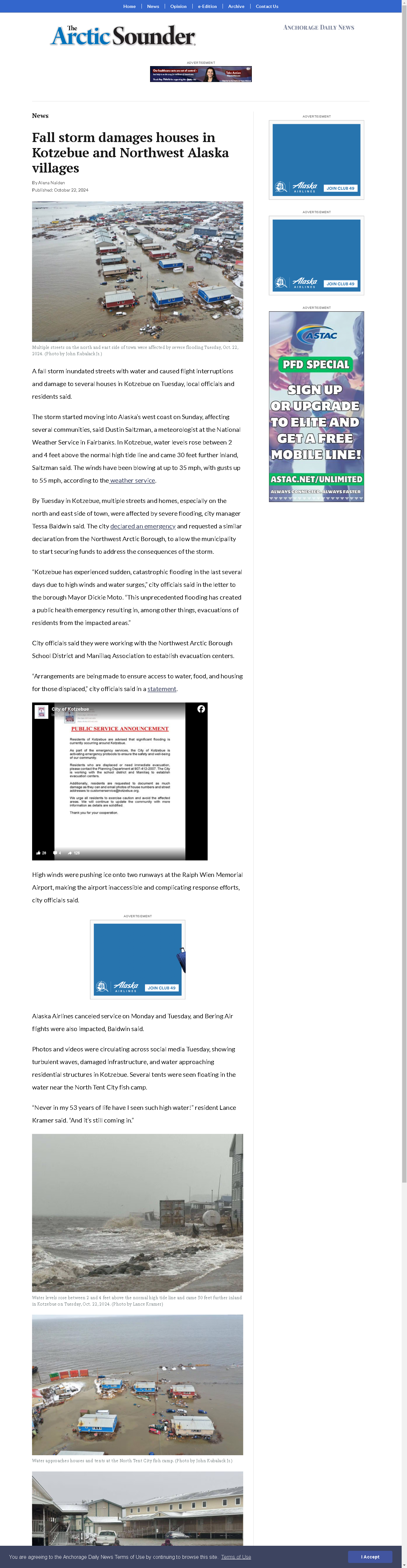 A severe fall storm caused significant damage in Kotzebue, Alaska, with high winds and rising water levels leading to airport inaccessibility, disrupted flights, and emergency declarations.