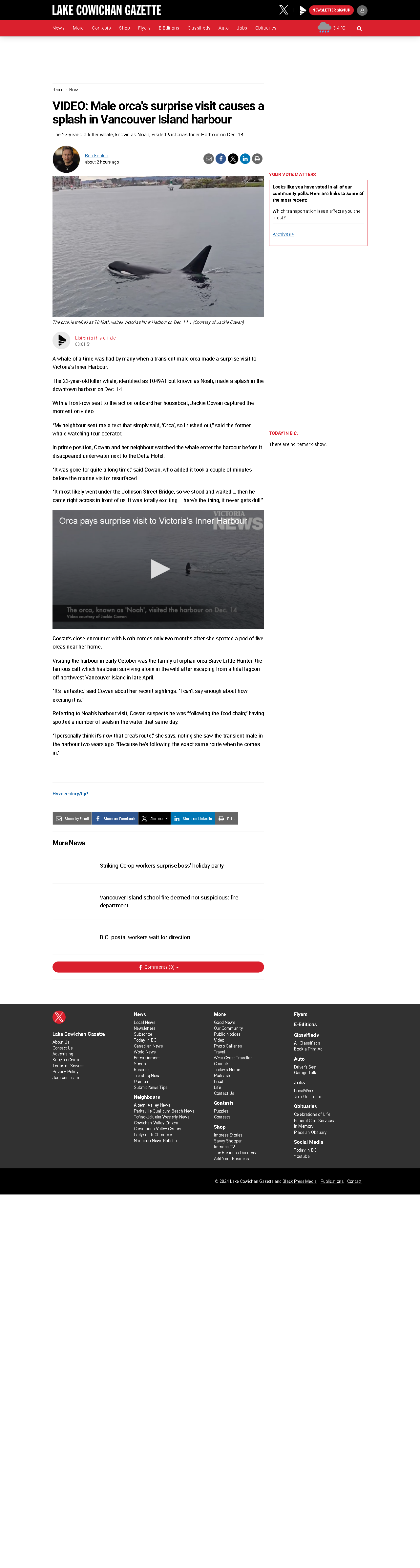 A 23-year-old male orca named Noah made a surprising visit to Victoria's Inner Harbour on December 14, causing excitement among locals.