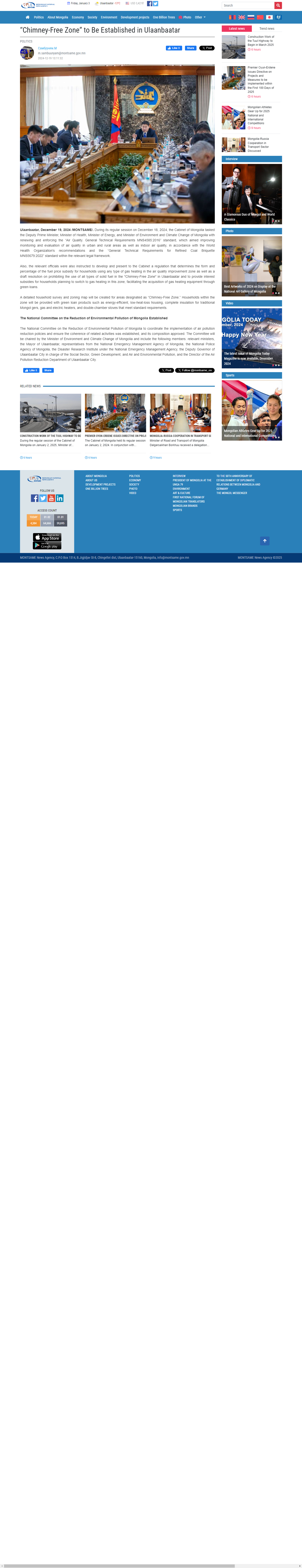 Mongolia's Cabinet has decided to implement a "Chimney-Free Zone" in Ulaanbaatar to improve air quality by banning solid fuel and promoting gas heating, alongside providing green loans and subsidies.