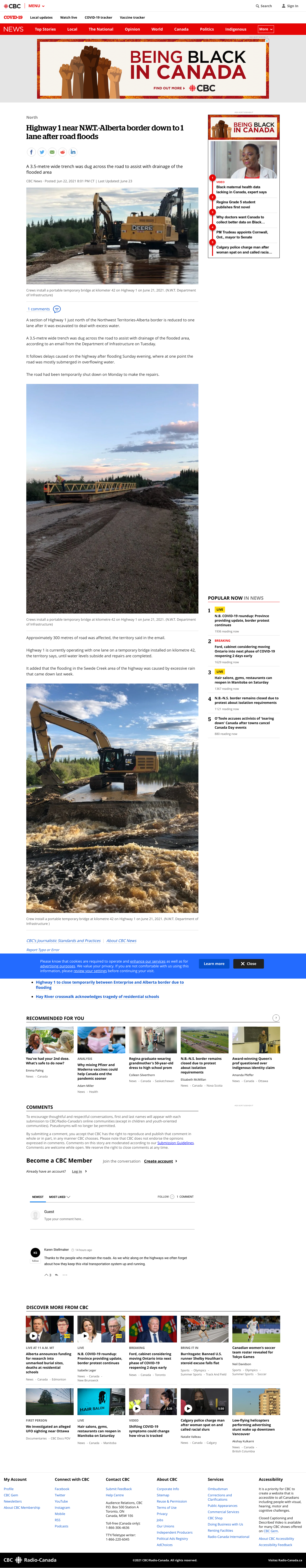A section of Highway 1 just north of the Northwest Territories-Alberta border is reduced to one lane after it was excavated to deal with excess water. A 3.5-metre wide trench was dug across the road to assist with drainage of the flooded area, according to an email from the Department of Infrastructure on Tuesday.