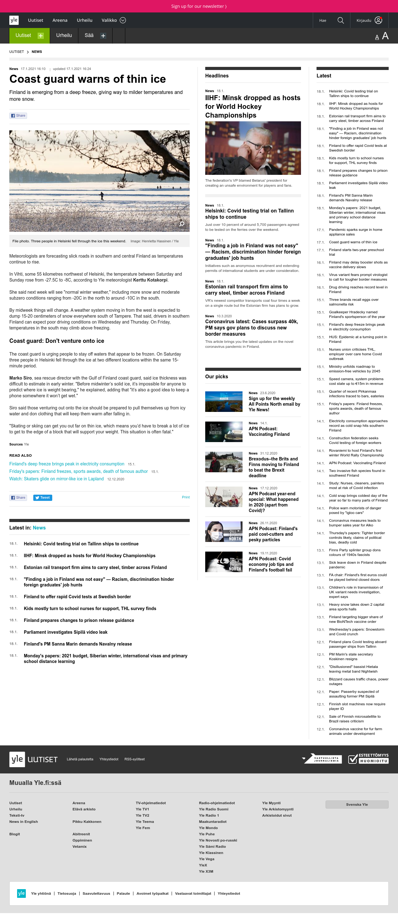 Finland is emerging from a deep freeze, giving way to milder temperatures and more snow. On Saturday three people in Helsinki fell through the ice at two different locations within the same 15-minute period.