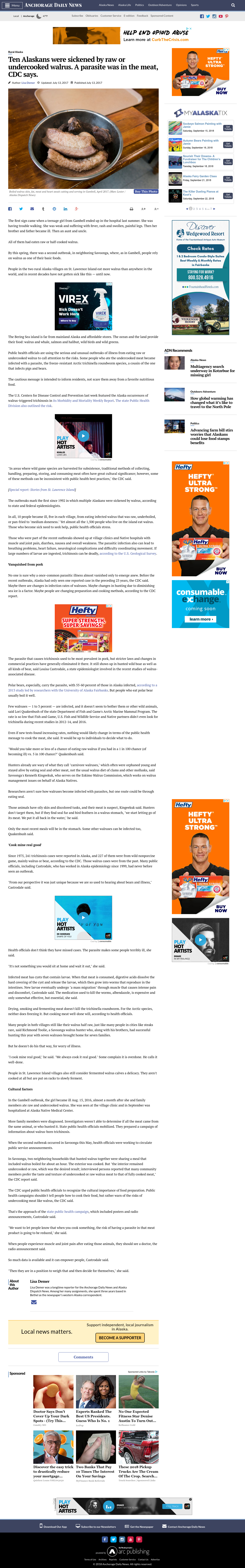 Alaskans from St. Lawrence Island were hospitalized with the food-borne parasite trichinella, which used to more typically infect pork. The CDC and state public health officials issued warnings.