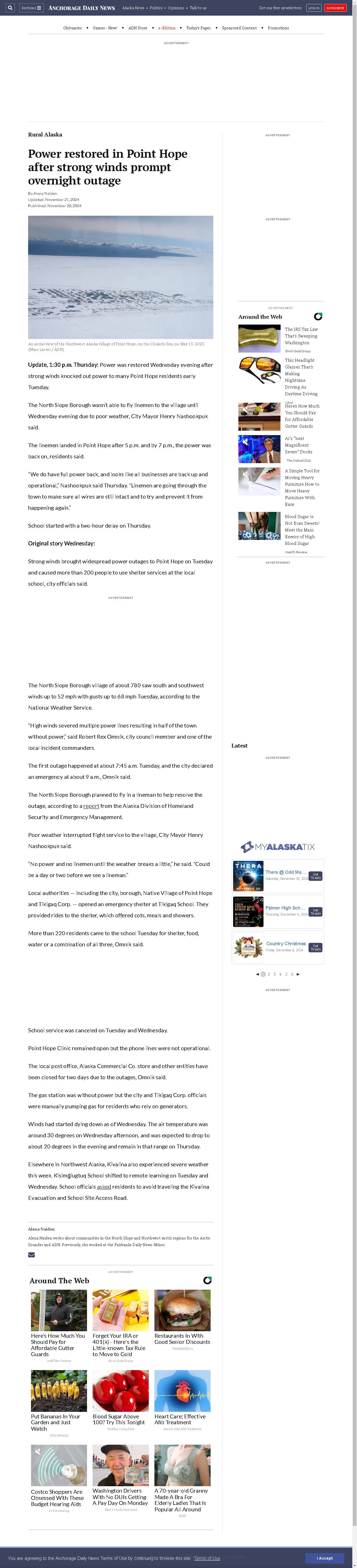 Unusually strong winds in Point Hope, Alaska, caused widespread power outages, prompting over 200 residents to seek shelter at a local school, while poor weather conditions delayed the arrival of a lineman to restore power.