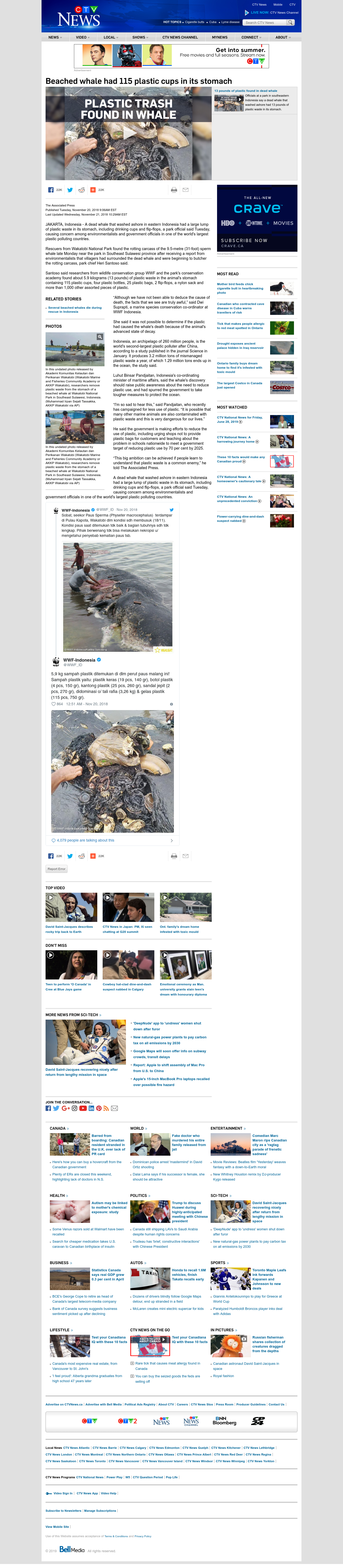 A dead whale that washed ashore in eastern Indonesia had a large lump of plastic waste in its stomach, including drinking cups and flip-flops, a park official said Tuesday, causing concern among environmentalists and government officials in one of the world's largest plastic polluting countries.