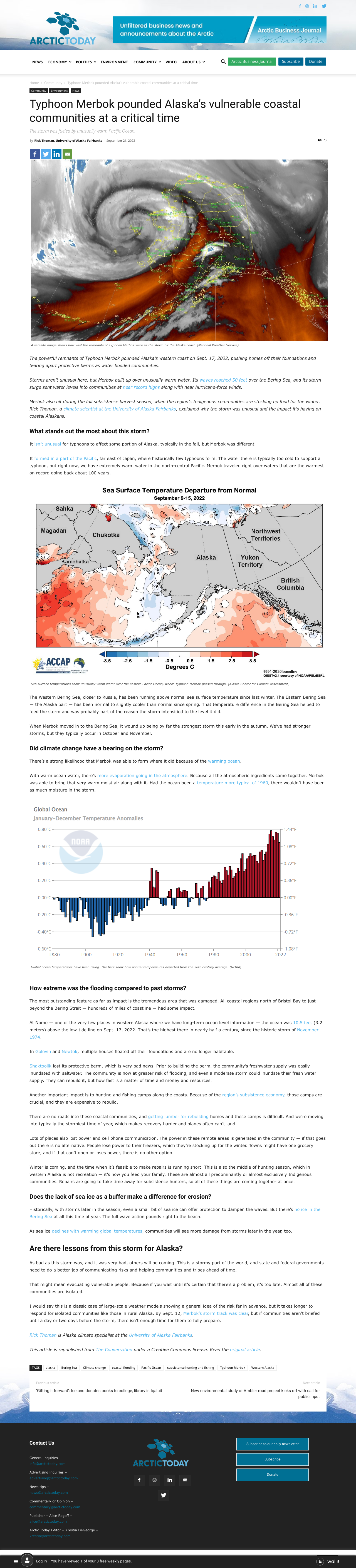 The powerful remnants of Typhoon Merbok pounded Alaska’s western coast on Sept. 17, 2022, pushing homes off their foundations and tearing apart protective berms as water flooded communities. Storms aren’t unusual here, but Merbok built up over unusually warm water. Its waves reached 50 feet over the Bering Sea, and its storm surge sent water levels into communities at near record highs along with near hurricane-force winds.