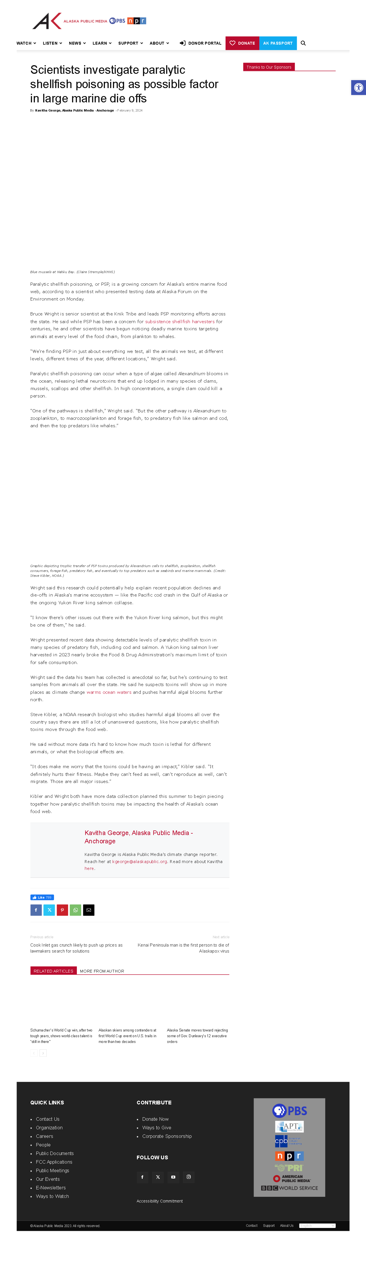 Scientists are investigating the widespread presence of paralytic shellfish toxins in Alaska's marine food chain, which may explain recent species die-offs.