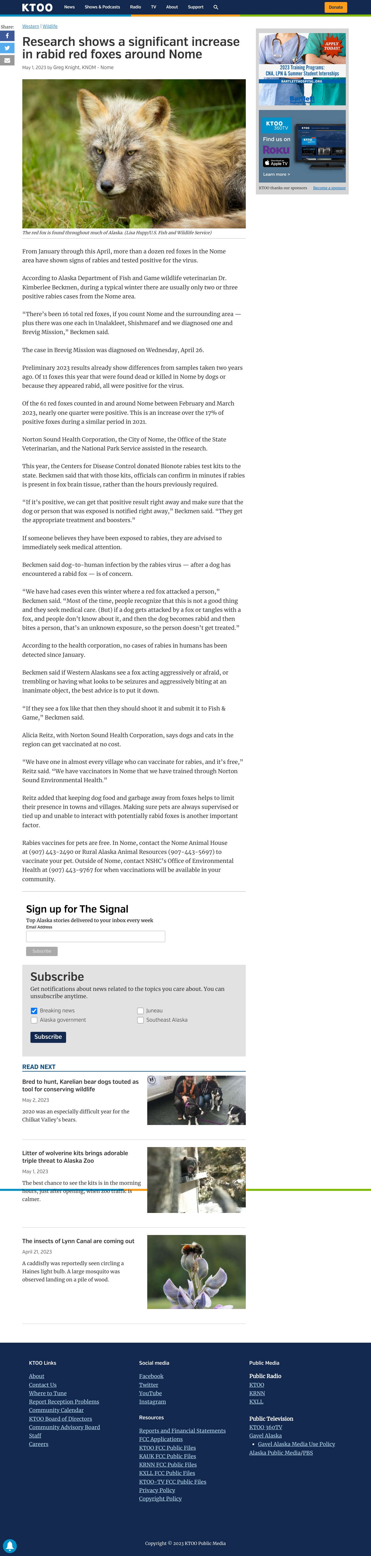 Of the 61 red foxes counted in and around Nome between February and March 2023, nearly one quarter were positive.