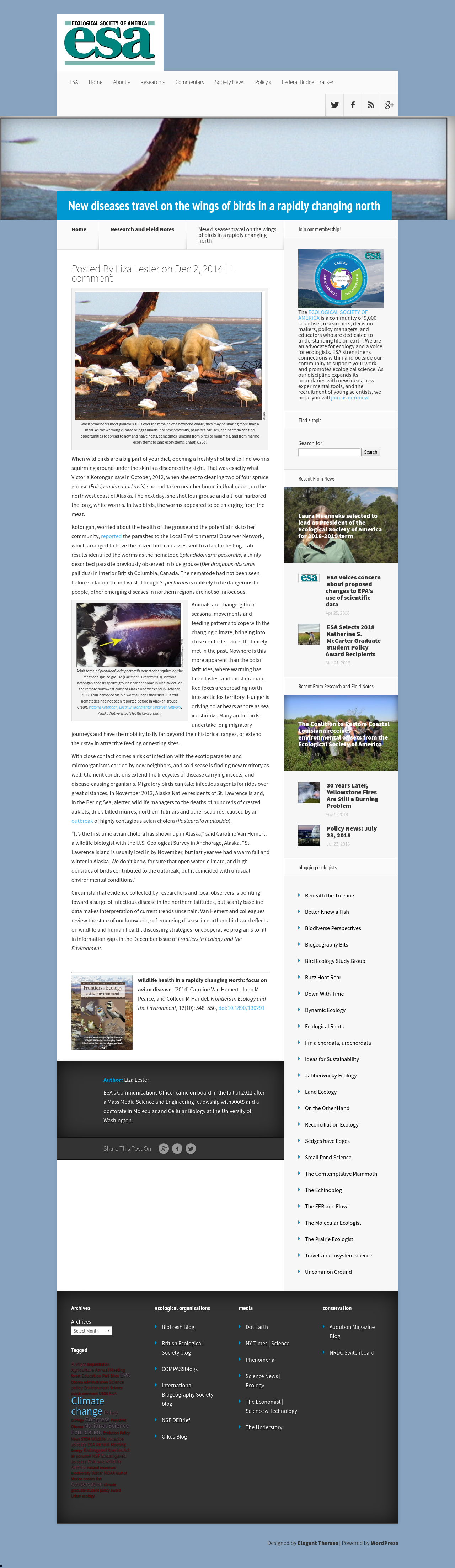 When wild birds are a big part of your diet, opening a freshly shot bird to find worms squirming around under the skin is a disconcerting sight. That was exactly what Victoria Kotongan saw in October, 2012, when she set to cleaning two of four spruce grouse (Falcipennis canadensis) she had taken near her home in Unalakleet, on the northwest coast of Alaska.