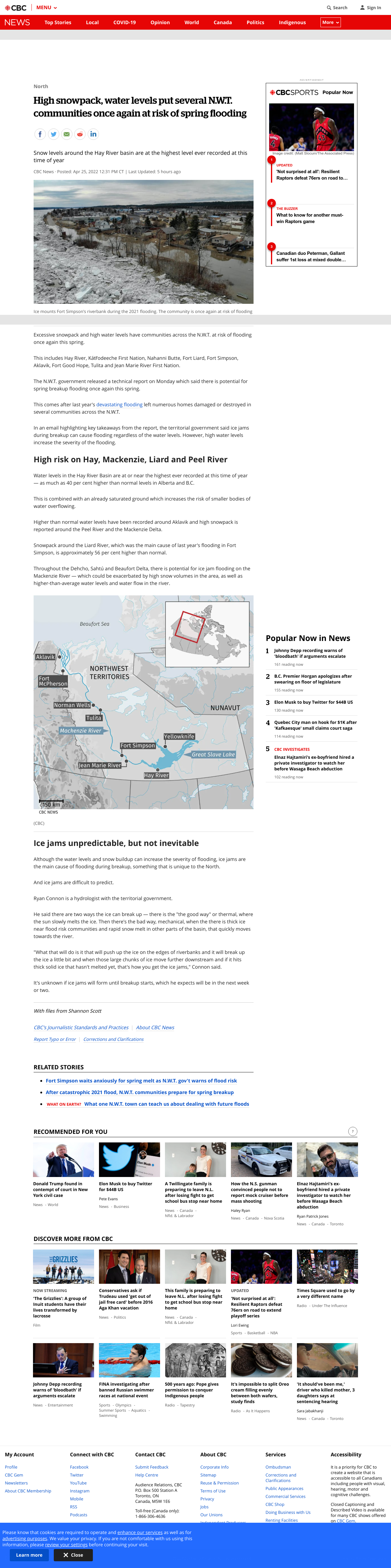 Excessive snowpack and high water levels have communities across the N.W.T. at risk of flooding once again this spring. This includes Hay River, Kátł'odeeche First Nation, Nahanni Butte, Fort Liard, Fort Simpson, Aklavik, Fort Good Hope, Tulita and Jean Marie River First Nation.