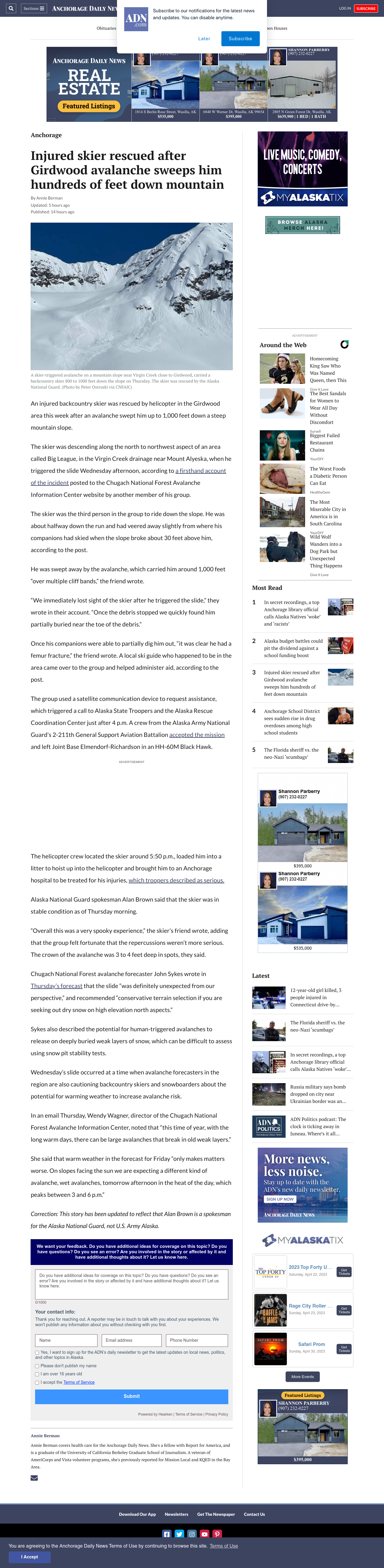The slide occurred at a time when forecasters in the region are cautioning backcountry skiers and snowboarders about the potential for warming weather to increase avalanche risk.