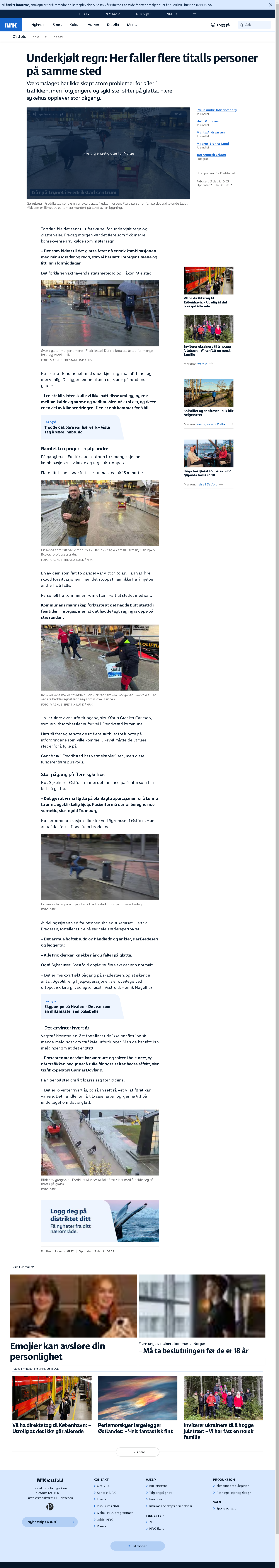 In Fredrikstad, a change in weather led to treacherous conditions for pedestrians, resulting in dozens of falls due to supercooled rain creating extremely slippery surfaces. Hospitals have reported a surge in related injuries.