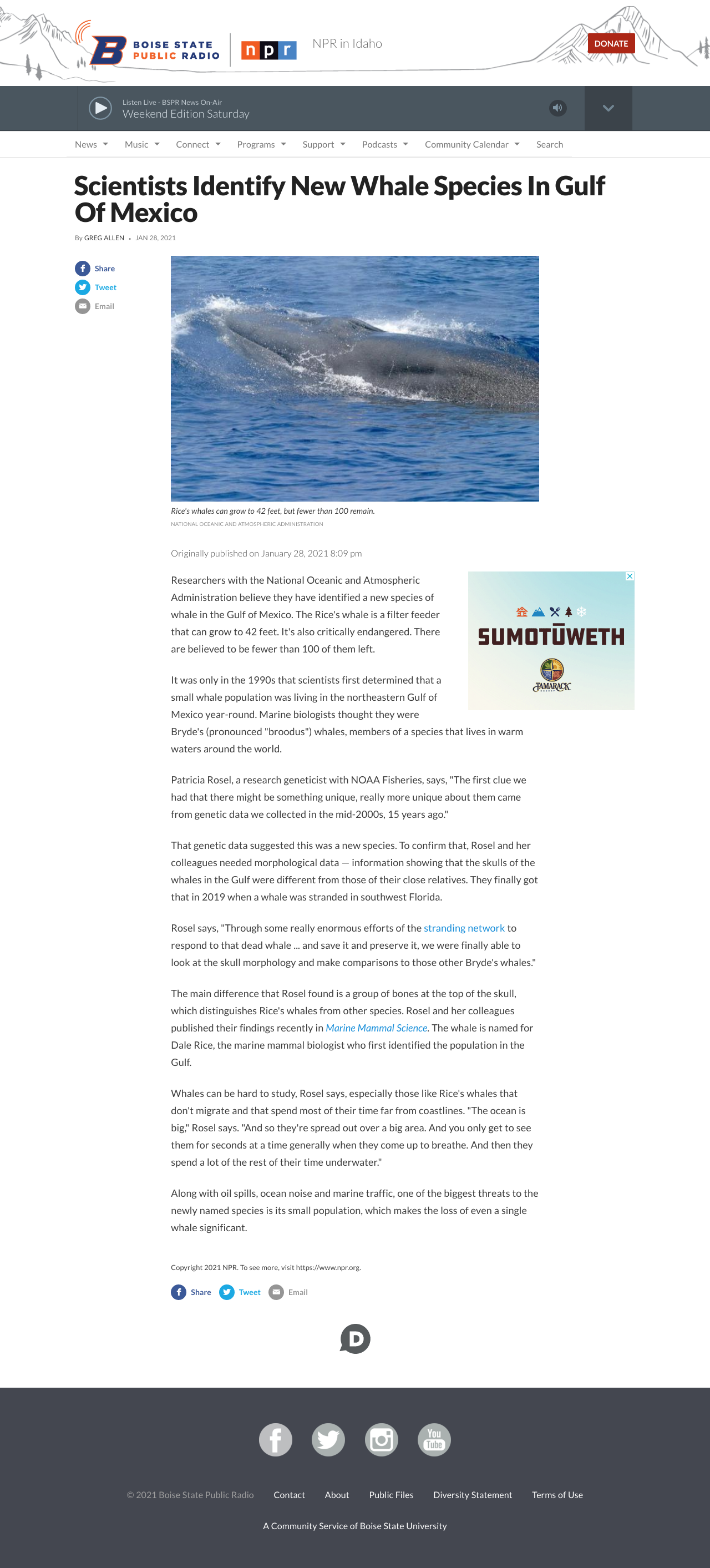 Researchers with the National Oceanic and Atmospheric Administration believe they have identified a new species of whale in the Gulf of Mexico. The Rice's whale is a filter feeder that can grow to 42 feet. It's also critically endangered. There are believed to be fewer than 100 of them left.