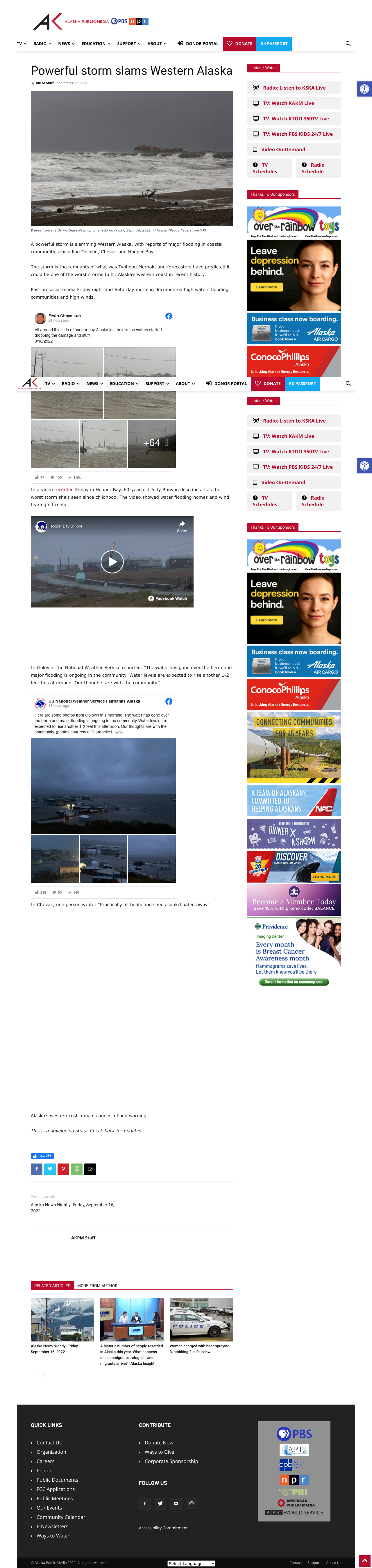 A historically powerful storm slammed into Western Alaska Friday night and into Saturday, bringing major flooding and high winds to a huge swath of coastal communities. By Saturday evening, the state said it had received no reports of injuries or deaths related to the storm. But damage had torn across hundreds of miles of Alaska’s coastline impacting communities all along the way. Alaskans described water flooding homes and roads. Wind tore off roofs. Houses floated off their foundations. Boats sank.