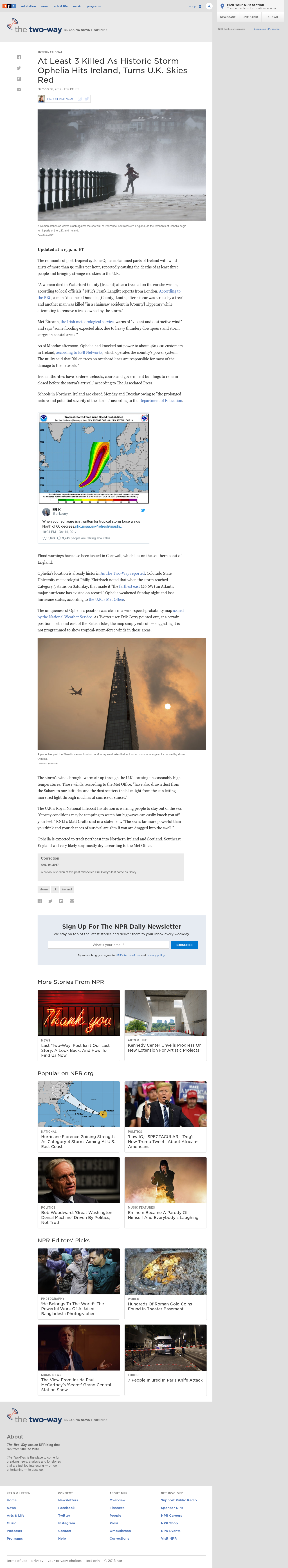 The remnants of post-tropical cyclone Ophelia hit parts of Ireland with gusts of more than 90 miles per hour. The storm knocked out power to some 360,000 customers.