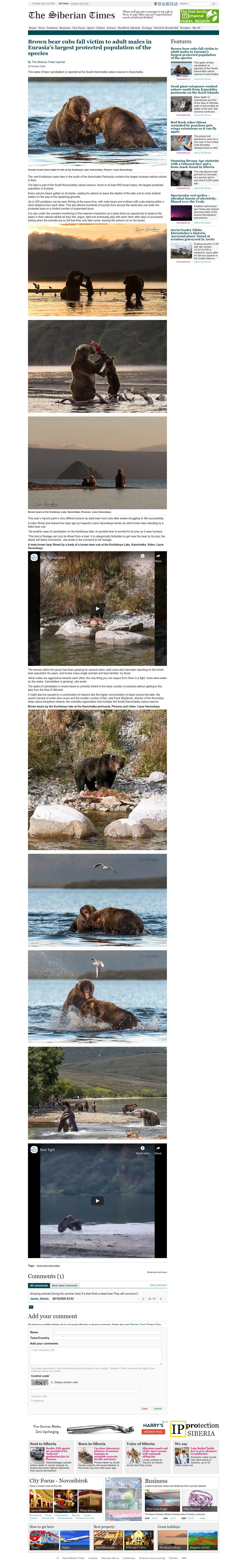 This spike of bear cannibalism is reported at the South-Kamchatka nature reserve in Kamchatka.The spike of cannibalism in brown bears is currently linked to the lower number of sockeye salmon getting to the lake from the Sea of Okhotsk.