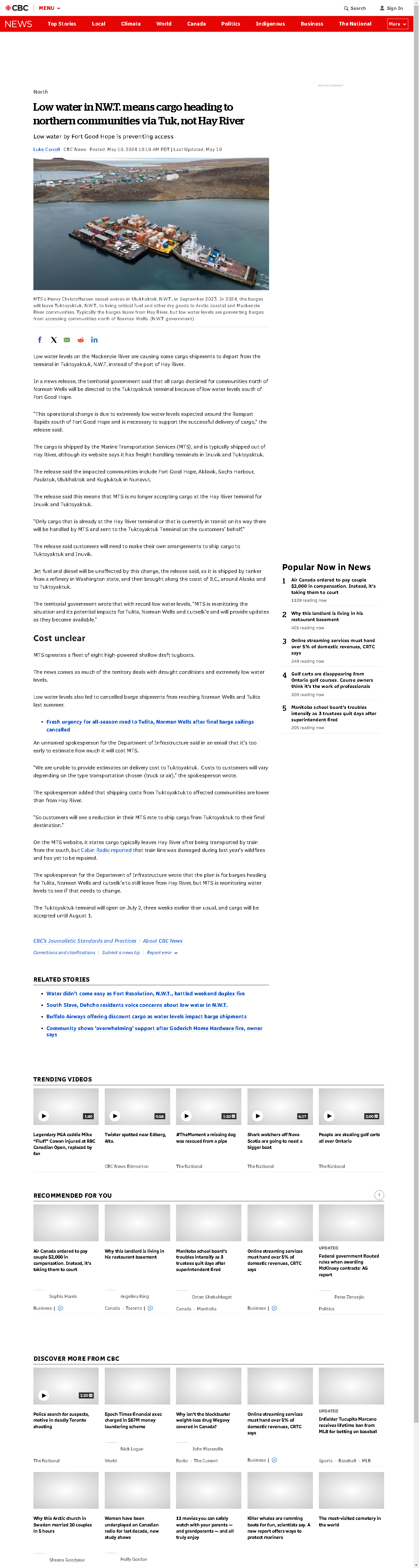 Low water levels on the Mackenzie River are causing cargo shipments to use a different route to access northern communities, beginning in the Arctic Ocean.
