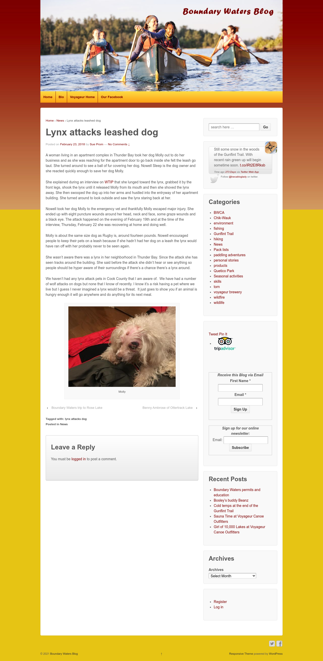 A woman living in an apartment complex in Thunder Bay took her dog Molly out to do her business and as she was reaching for the apartment door to go back inside she felt the leash go taut.