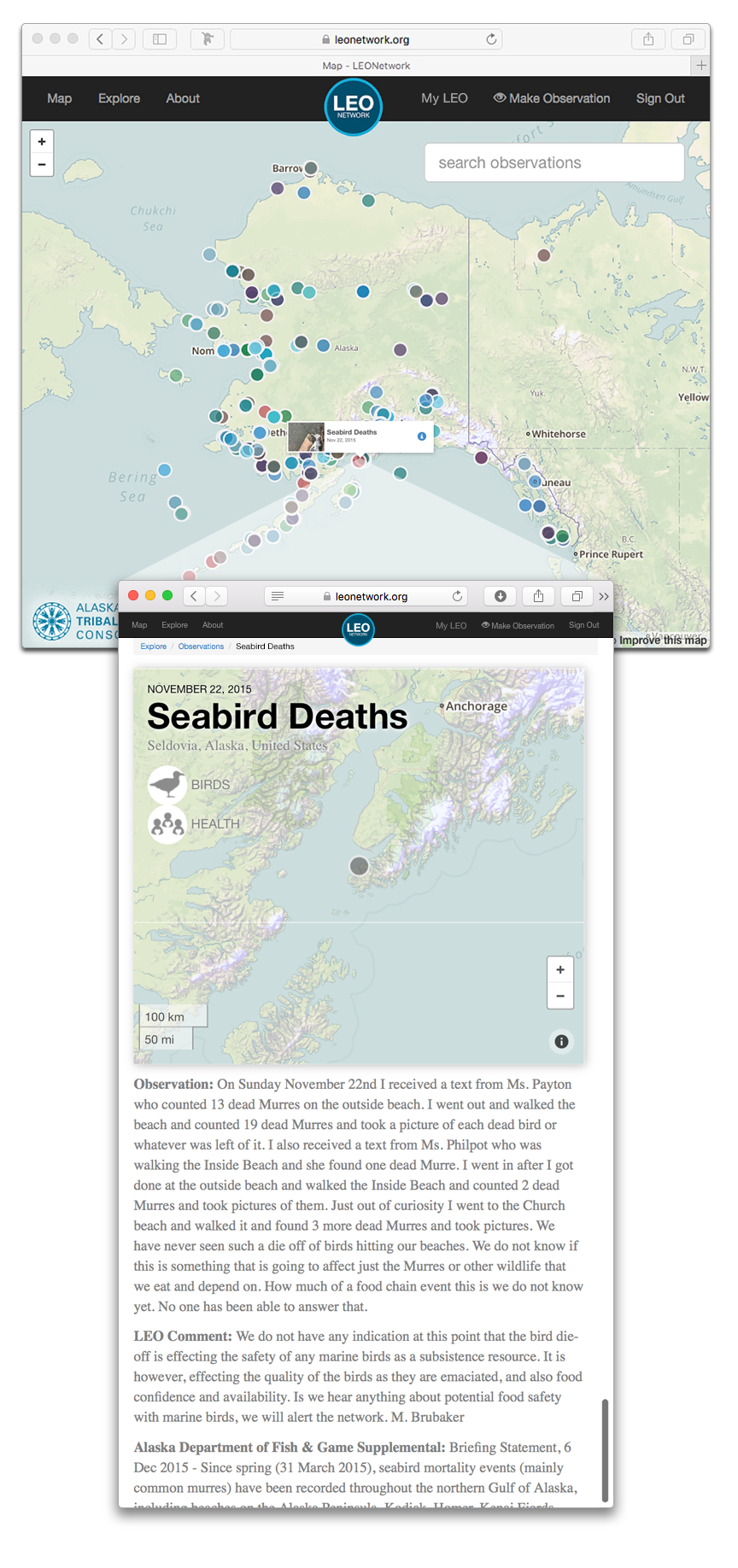 All observations must meet the publication criteria to be shared on the Network. An observation can be made from anywhere and recorded using the LEO Reporter App or the LEO Network website. Examples of observations include unusual changes in weather, seasons, the land, seas and wildlife, in addition to the occurrence of natural disasters and pollution.