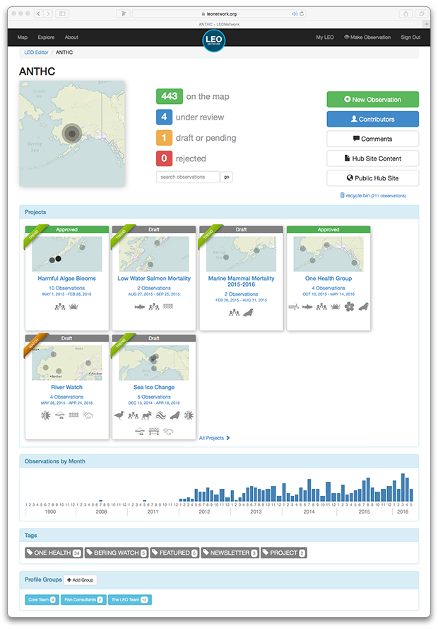 The software used for supporting an observation or project is called LEO Editor and is currently only available to hubs. Hubs can use the Editor tools to add media, select key consultants, add links and content and communicate with consultants and observers. Hubs select observations they want to support and can add comments of consultations or forward the observations for consultations. Hubs can also use Editor to create projects (see Project section). Access to LEO Editor is granted when a new hub is established.