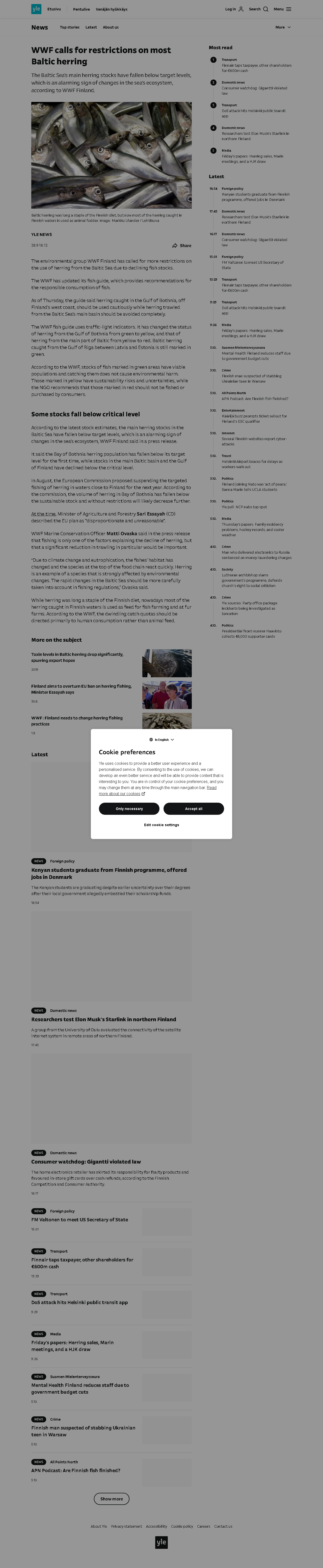 The Baltic Sea's main herring stocks have fallen below target levels, which is an alarming sign of changes in the sea's ecosystem, according to WWF Finland.