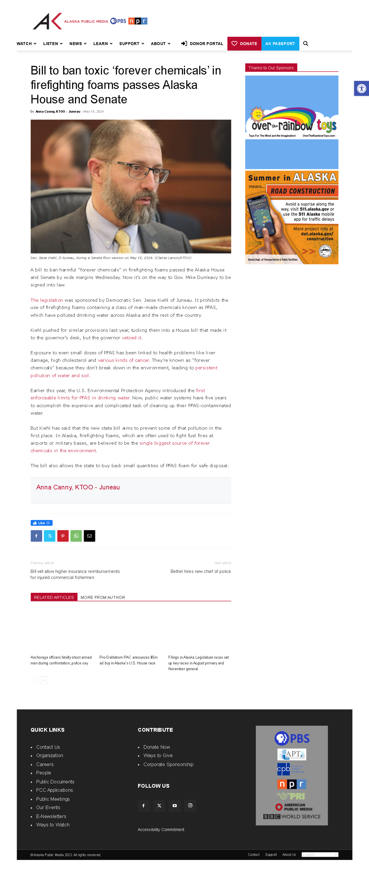 Alaska's legislature has passed a bill to ban PFAS chemicals in firefighting foams, addressing the contamination of drinking water.