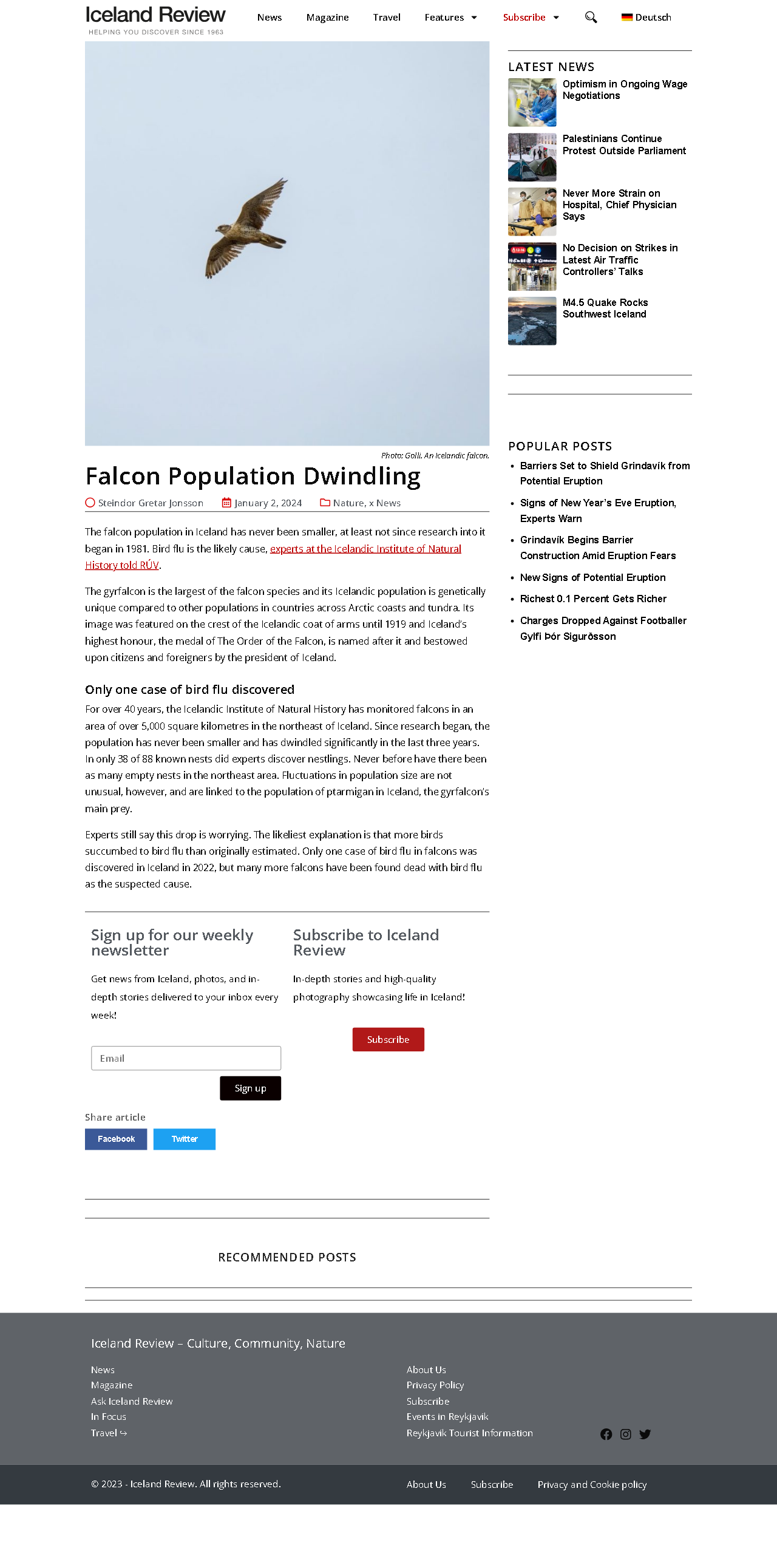 The Icelandic gyrfalcon population is at its lowest, with many nests empty, likely due to a higher than estimated impact of bird flu.