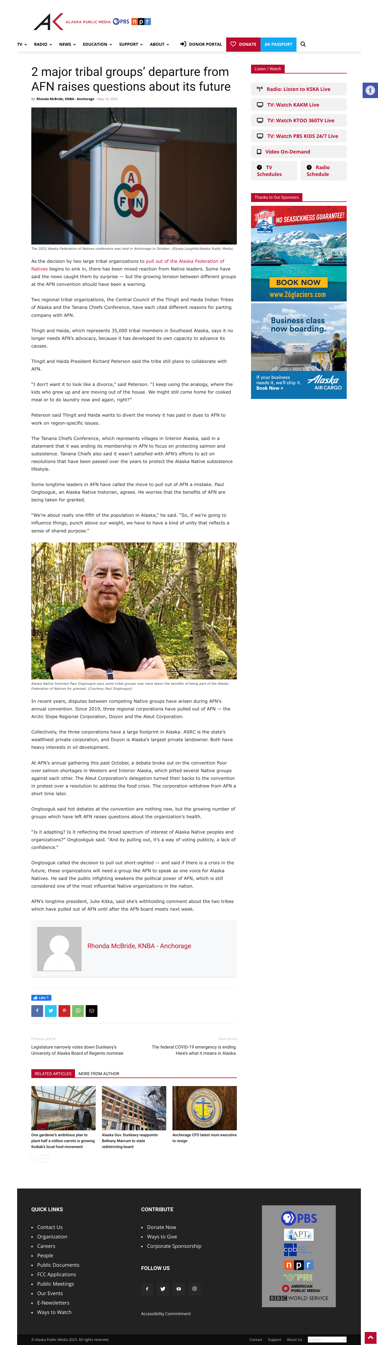 Two regional tribal organizations, the Central Council of the Tlingit and Haida Indian Tribes of Alaska and the Tanana Chiefs Conference, have each cited different reasons for parting company with AFN.
