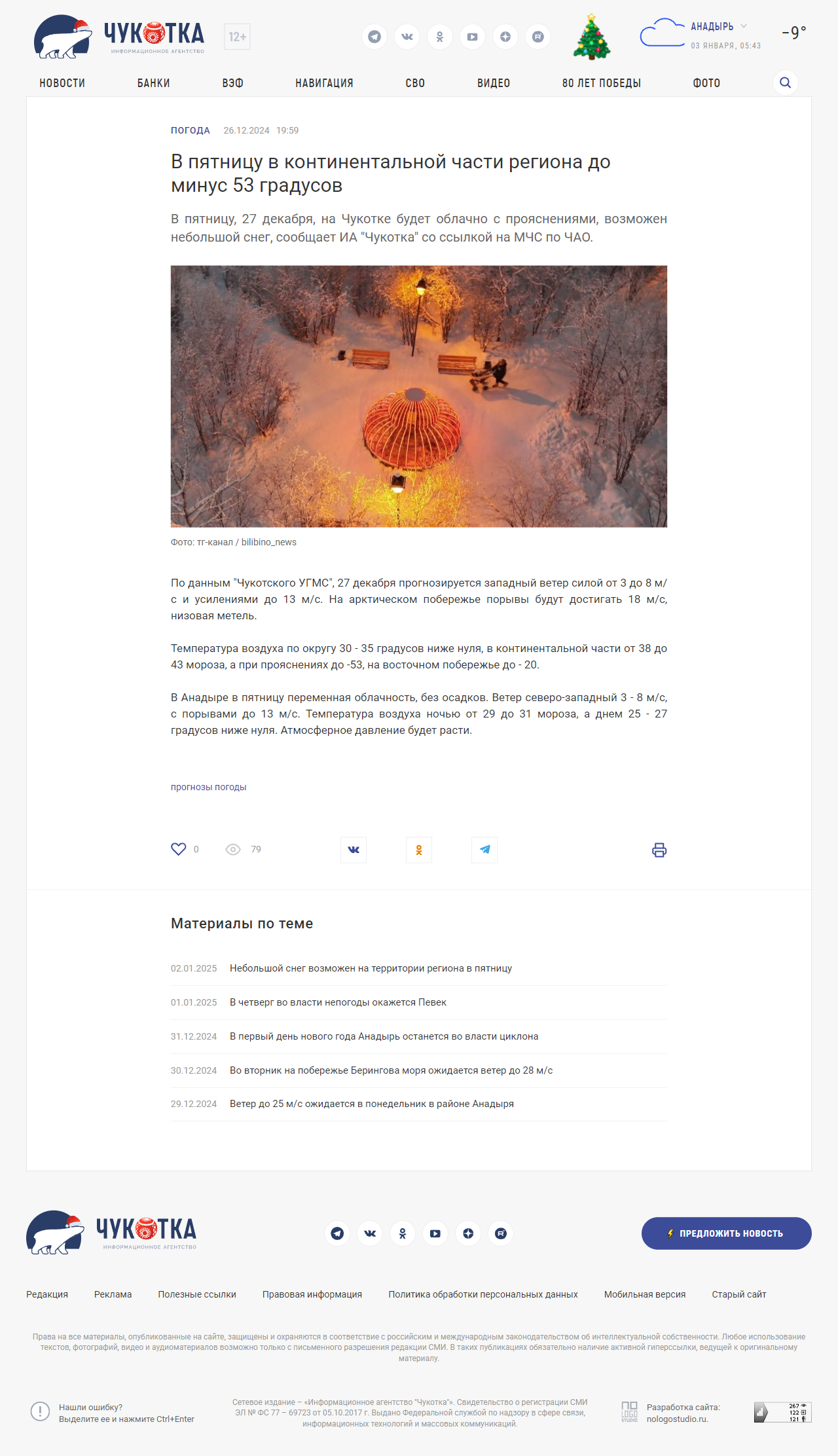 On December 27, Chukotka will experience cloudy weather with patches of clearing, and temperatures may drop to minus 53 degrees in the continental region.