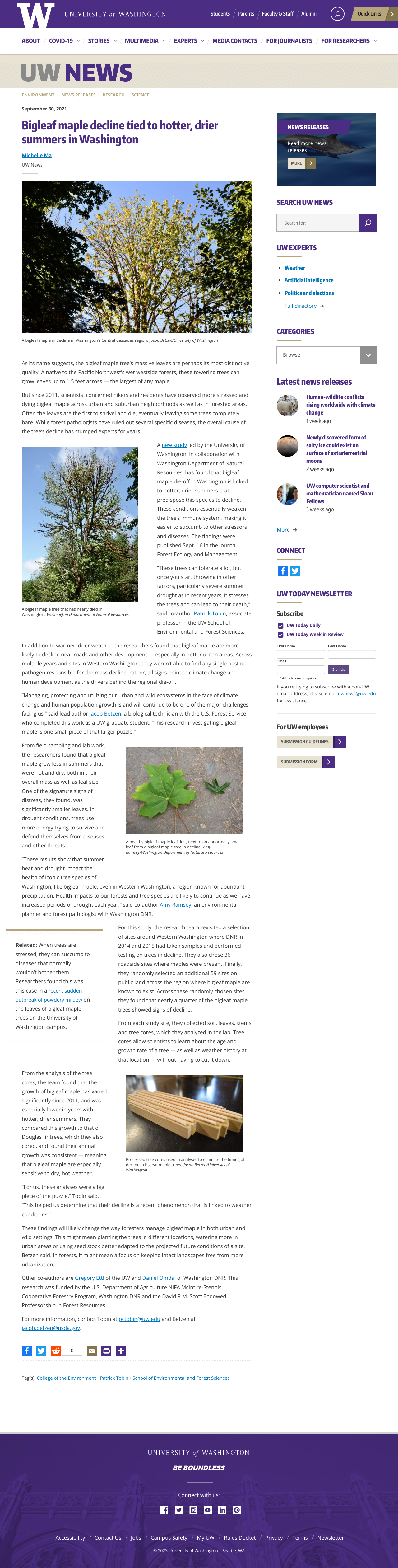 Bigleaf maple decline tied to hotter, drier summers in Washington