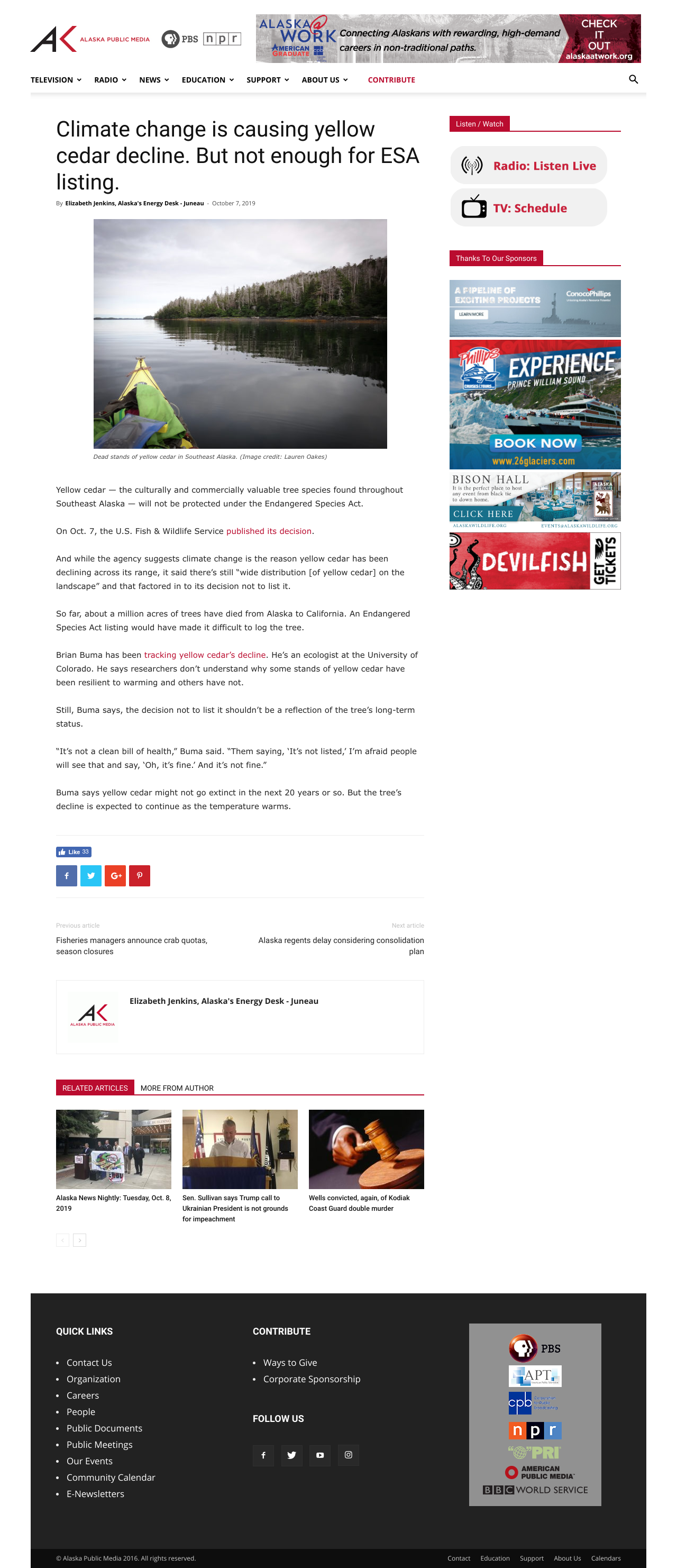 So far, about a million acres of trees have died from Alaska to California. An Endangered Species Act listing would have made it difficult to log the tree.